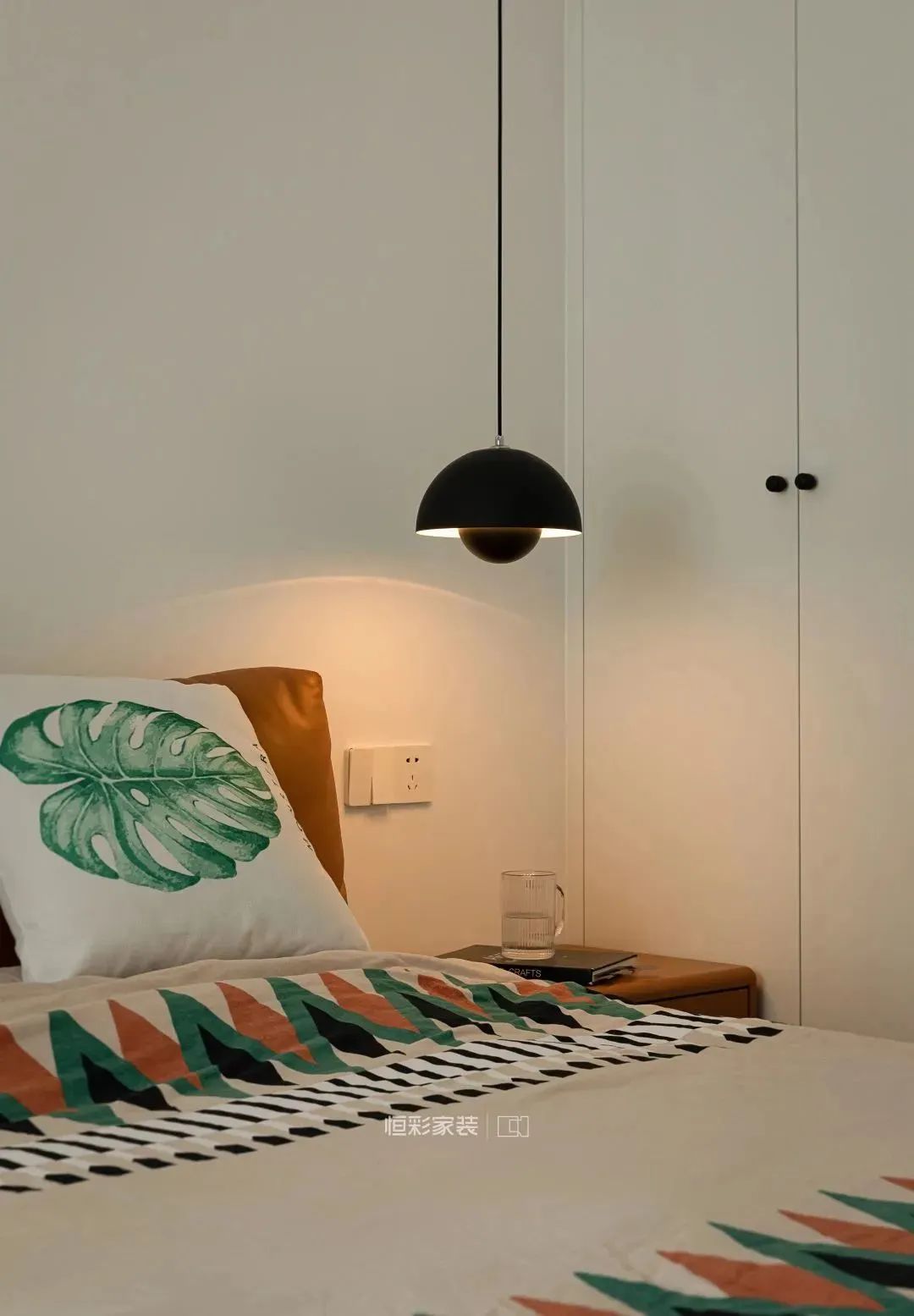 主卧房门过道延长,利用过道空间木工定制一组衣柜,另一边衣柜空间隔出一半用作主卫空间马桶区,均衡了一下主卫空间。主卧空间选择简单的背景色调,大白墙搭配丹麦简约花苞吊灯,棕色家具加重空间色彩。