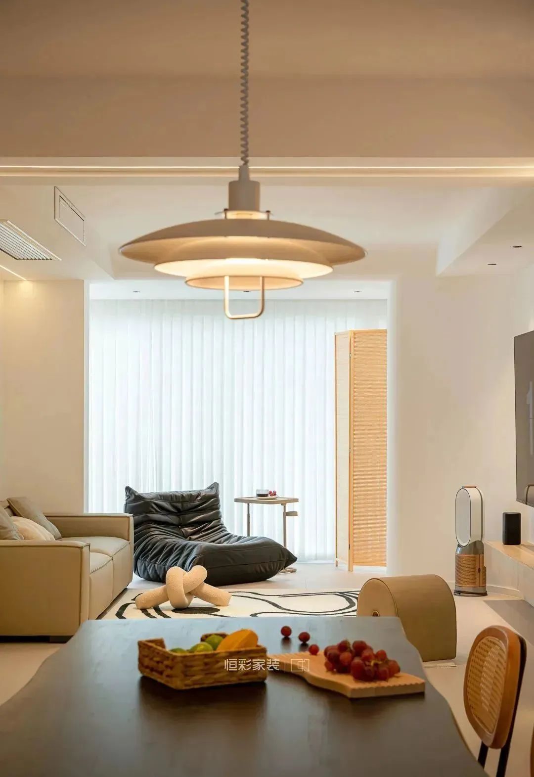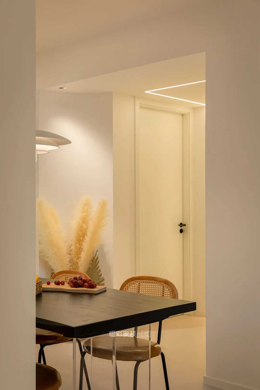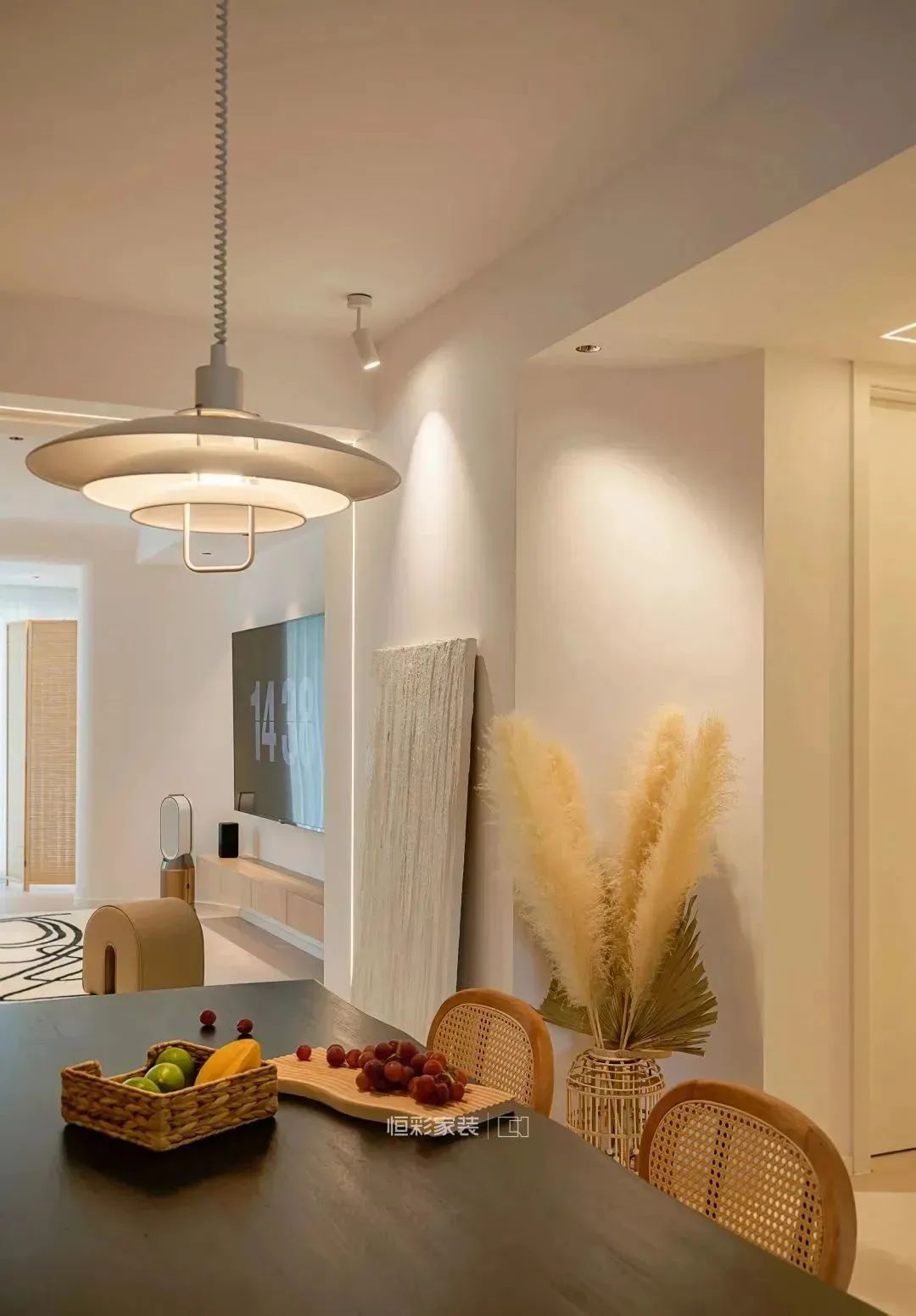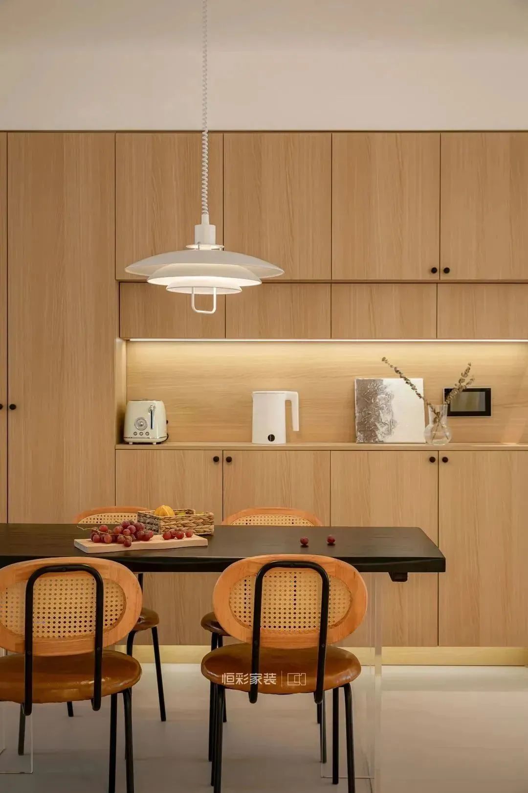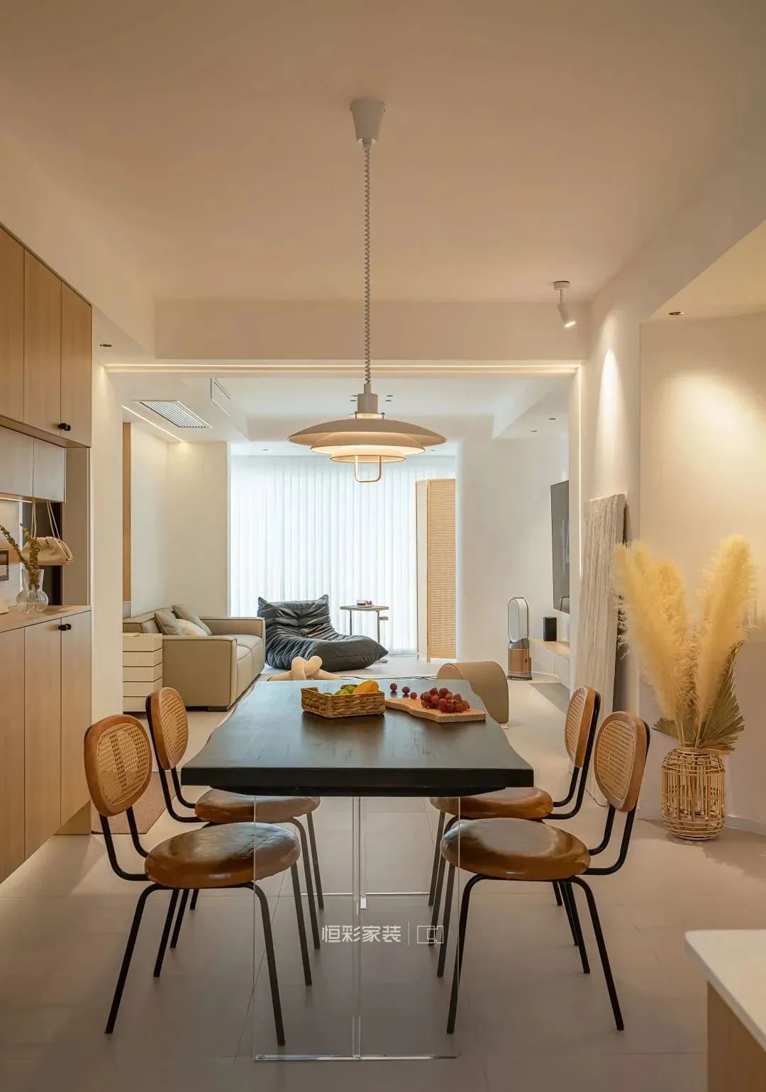 餐厅保留整体暖调配色,亚克力悬浮餐桌搭配复古铁艺藤编餐椅,丹麦设计师款弹簧升降吊灯为其加分。