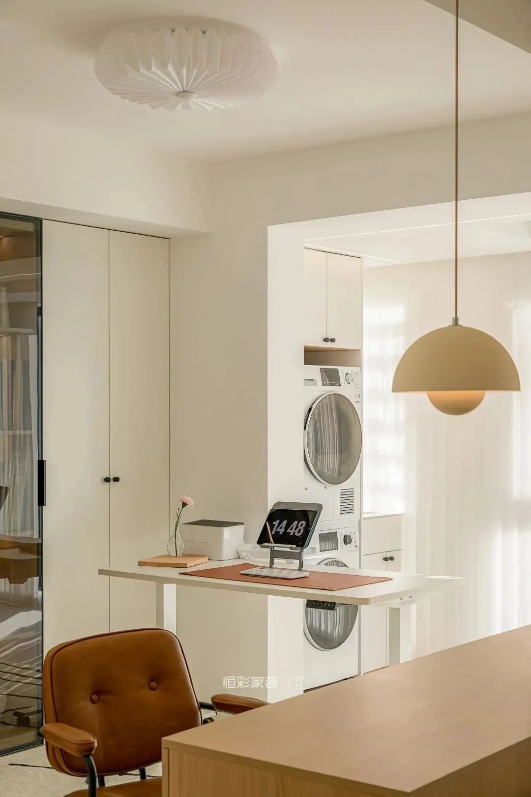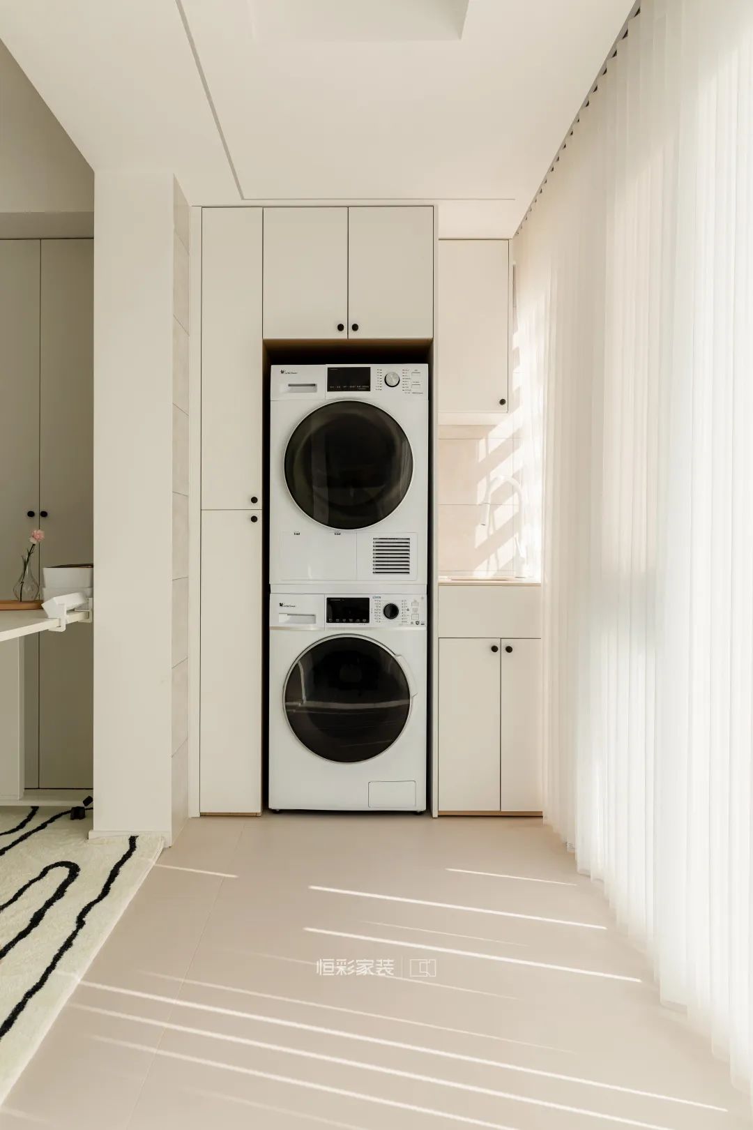 生活阳台将原有户型空间隔断墙全部打掉,做成了一体式大阳台,一头作为休闲阳台,一头作为生活阳台使用,定制储物柜,嵌入洗衣机、烘干机,打造洗晒一体的功能性阳台。