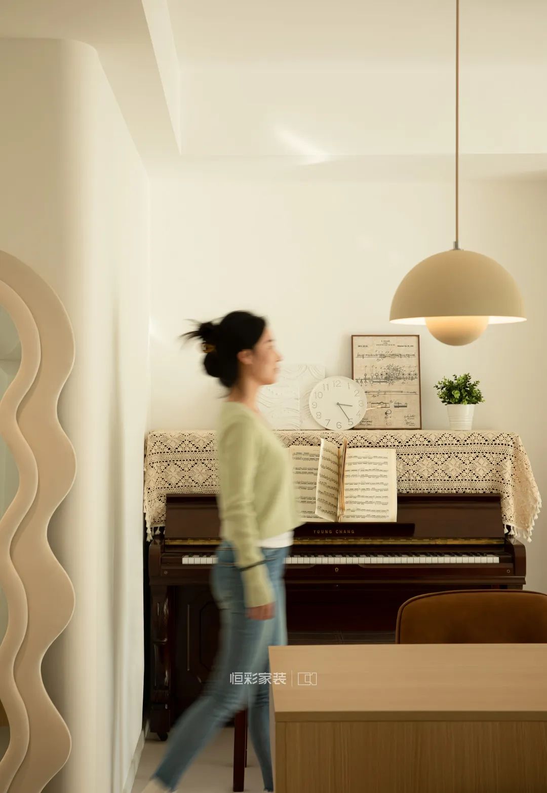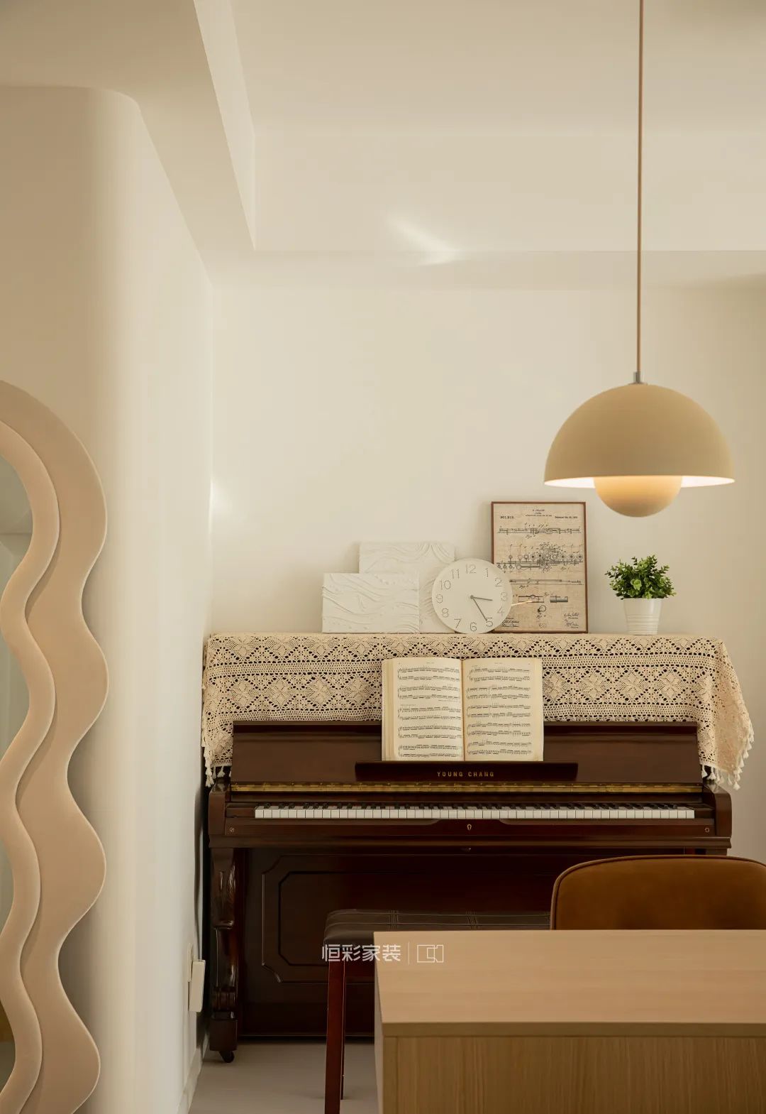 靠墙摆放的古典钢琴,米色镂空复古棉钢琴罩,搭配一些简单的小摆件,艺术值拉满。背后靠墙定制的书桌,还能成为一个独立的工作区域,互不干扰。小拐角空间也不放过,放上当下流行的云朵穿衣镜,既不浪费空间,又很实用。