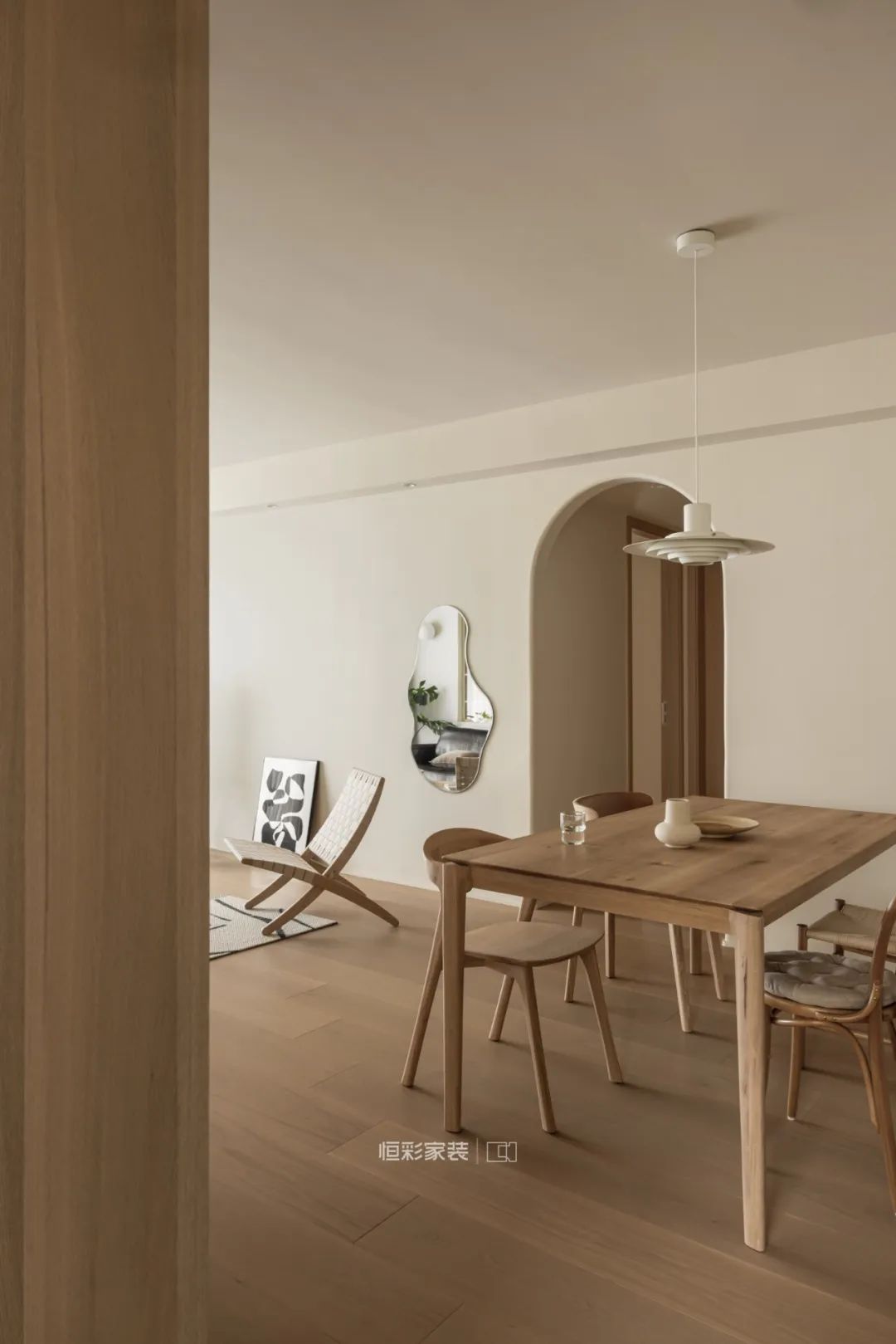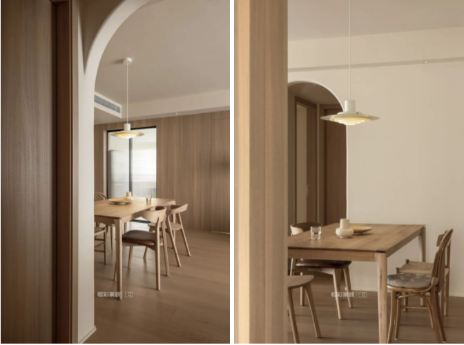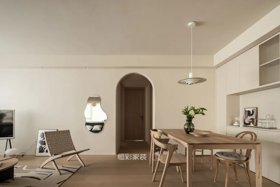 原木餐桌椅与奶油调背景色相得益彰,通往卧室的弧形过道门洞,搭配木色家具,增加了空间想要打造的柔和感。客餐厅墙面使用云朵墙贴镜作穿衣镜使用,同时不同的空间映射效果还能增加空间感。