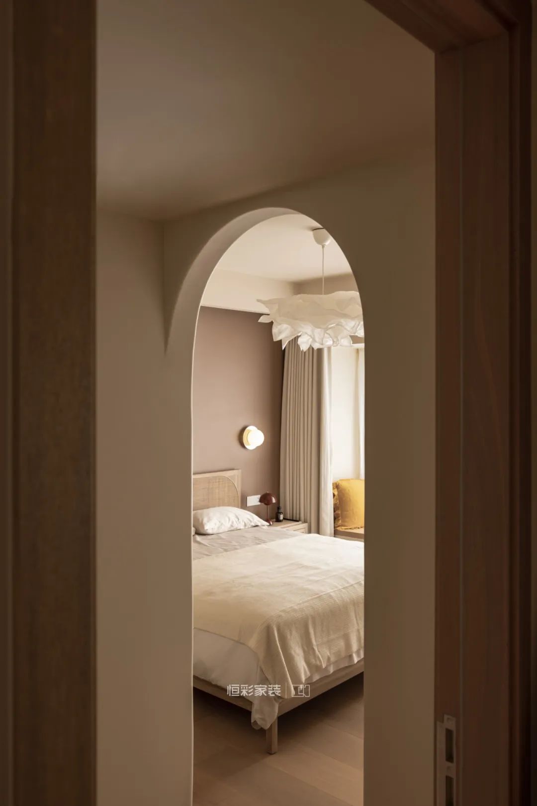 卧室的弧形门洞设计和客厅公共空间的弧形相呼应,增加了空间的联动性。