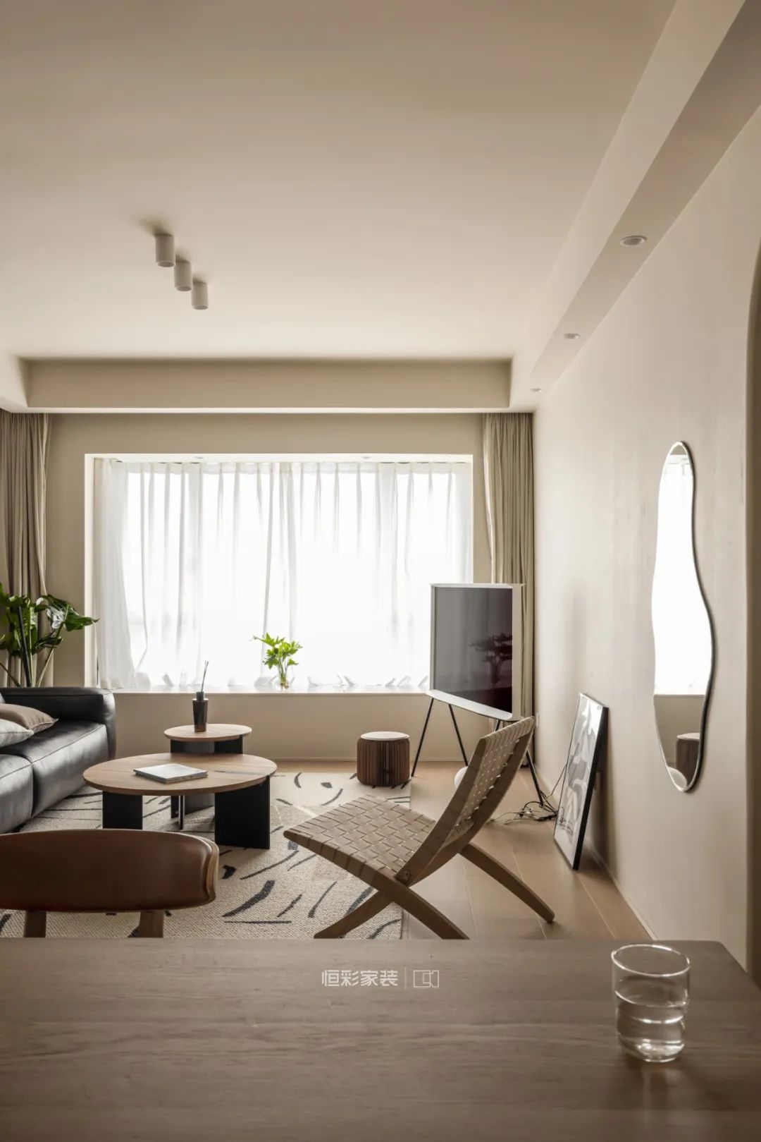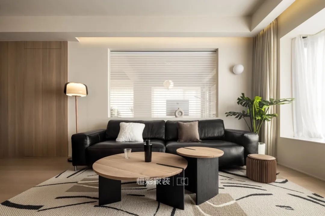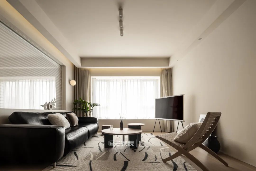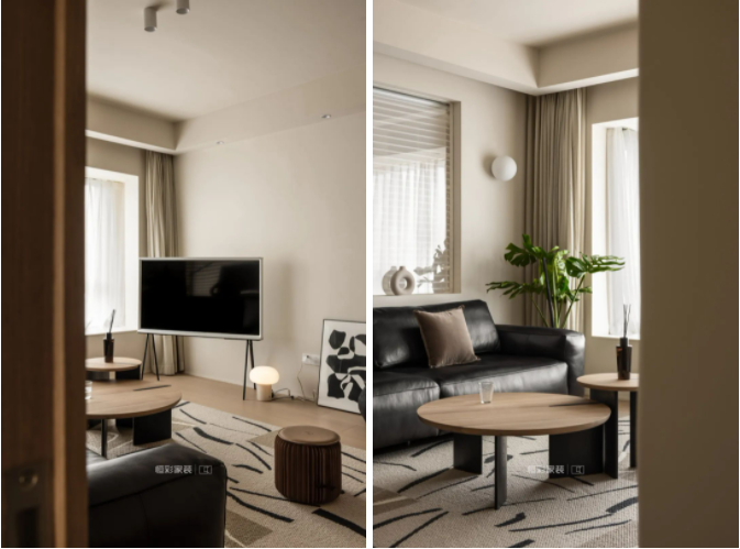 硬装上,十分简洁没有设计具象的背景墙,搭配了木色木质的家具,棉麻的地毯和抱枕,让整个空间柔和温暖。