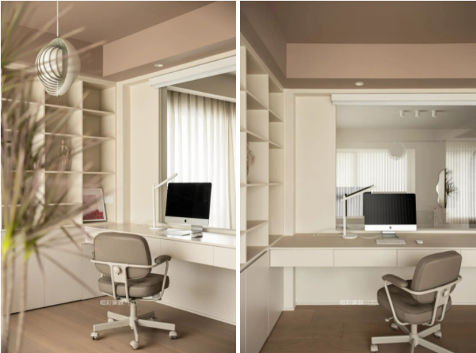 书房整体空间非常开阔,成品定制的柜子在颜色选择上尽可能接近墙体颜色,打造了硬装基础色调统一的视觉感,使得空间很简洁。为了不过于单调,在顶面的乳胶漆上没有用传统的白色,而是调了一个有温度且不张扬的颜色。