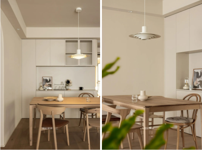进门之后即是餐厅,奶白色的螺旋吊灯和墙面颜色相呼应,打造统一的奶油调。
