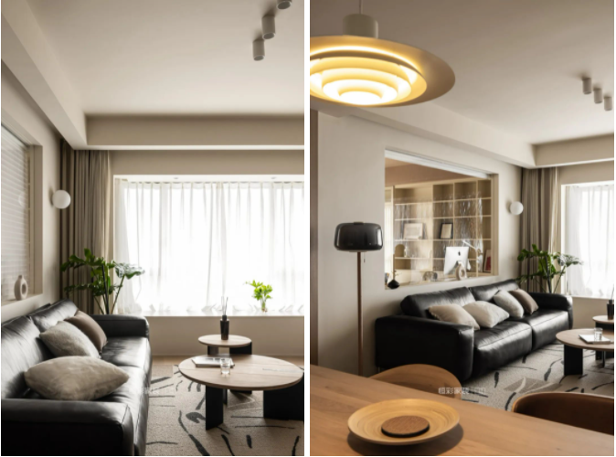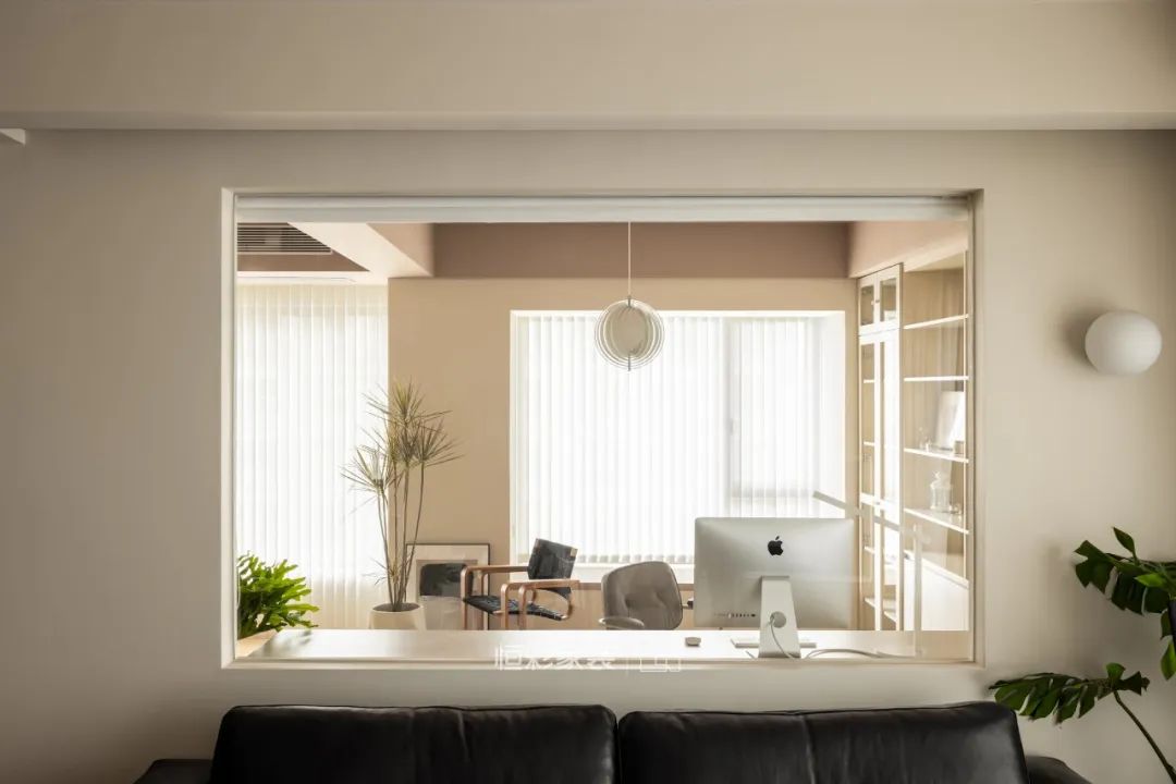 客厅背后两个小房间打通做成一个大房间,沙发背景延长,客厅与书房之间做了一个半开放设计。中间镂空部分设计了一面玻璃墙,让两个空间更通透,连贯。必要时,玻璃后面使用香格里拉帘进行隔断。