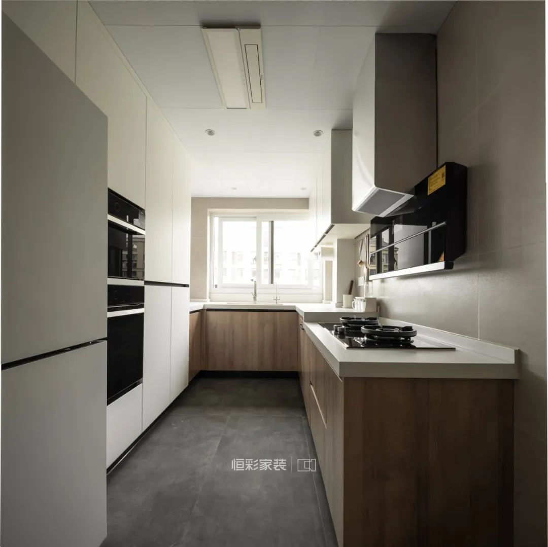 厨房将阳台打通包进来,增加了厨房空间。地面是灰色大砖,和白色高柜,灰色冰箱相融合,形成一种简洁高级的感觉;橱柜地柜依然沿用了整屋的基础原木调,在简洁高级中不失温馨。