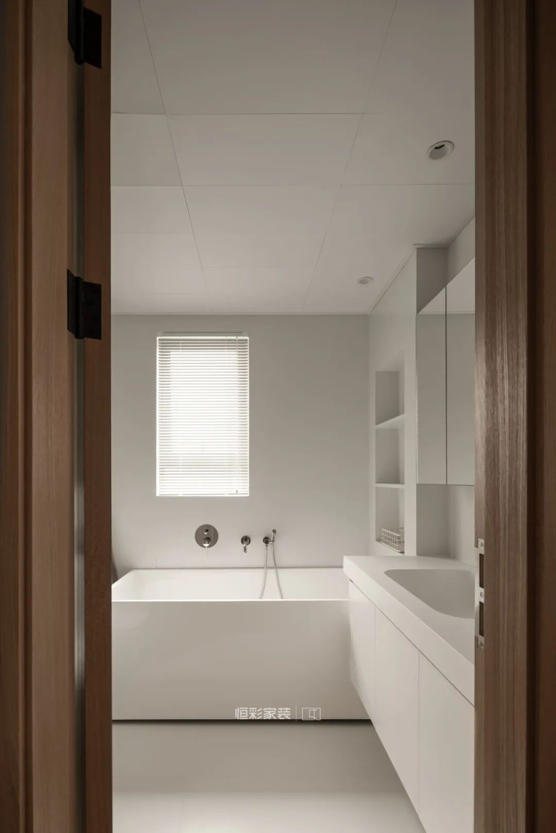 卫生间墙面和地面采用了同款70度白瓷砖,成品定制浴室柜,在颜色的选择上也尽可能的接近墙地砖颜色,最后整个空间呈现出非常极简干净的感觉。