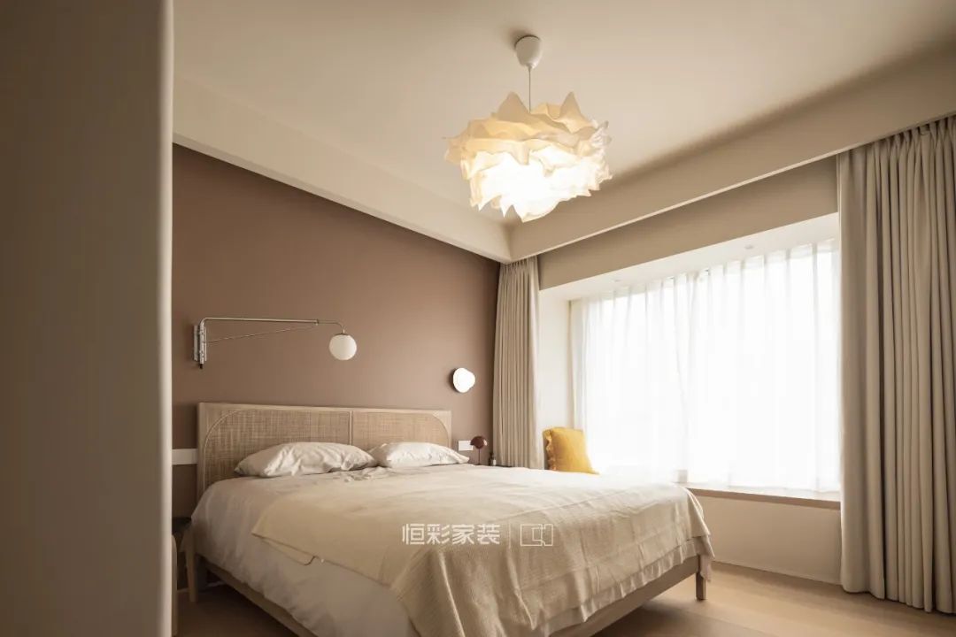 日式云朵纸艺吊灯,搭配床头的可移动壁灯设计,在看书和睡觉的时候,可以移动壁灯角度,满足不同照明需求。