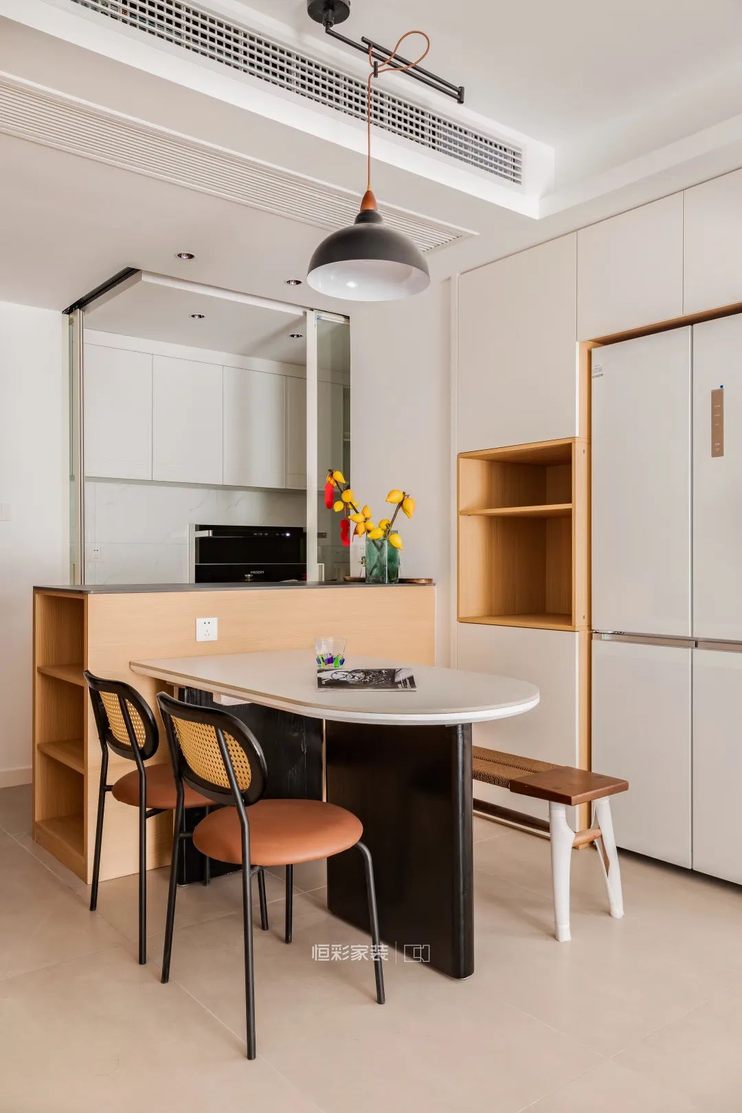 厨房与餐厅之间的隔断墙拆除,改为吧台,半开放设计增加了餐厨间的空间衔接和交流。厨房空间做了吊柜移门设计,透明玻璃不做视觉隔断,却能很好地阻隔油烟。
