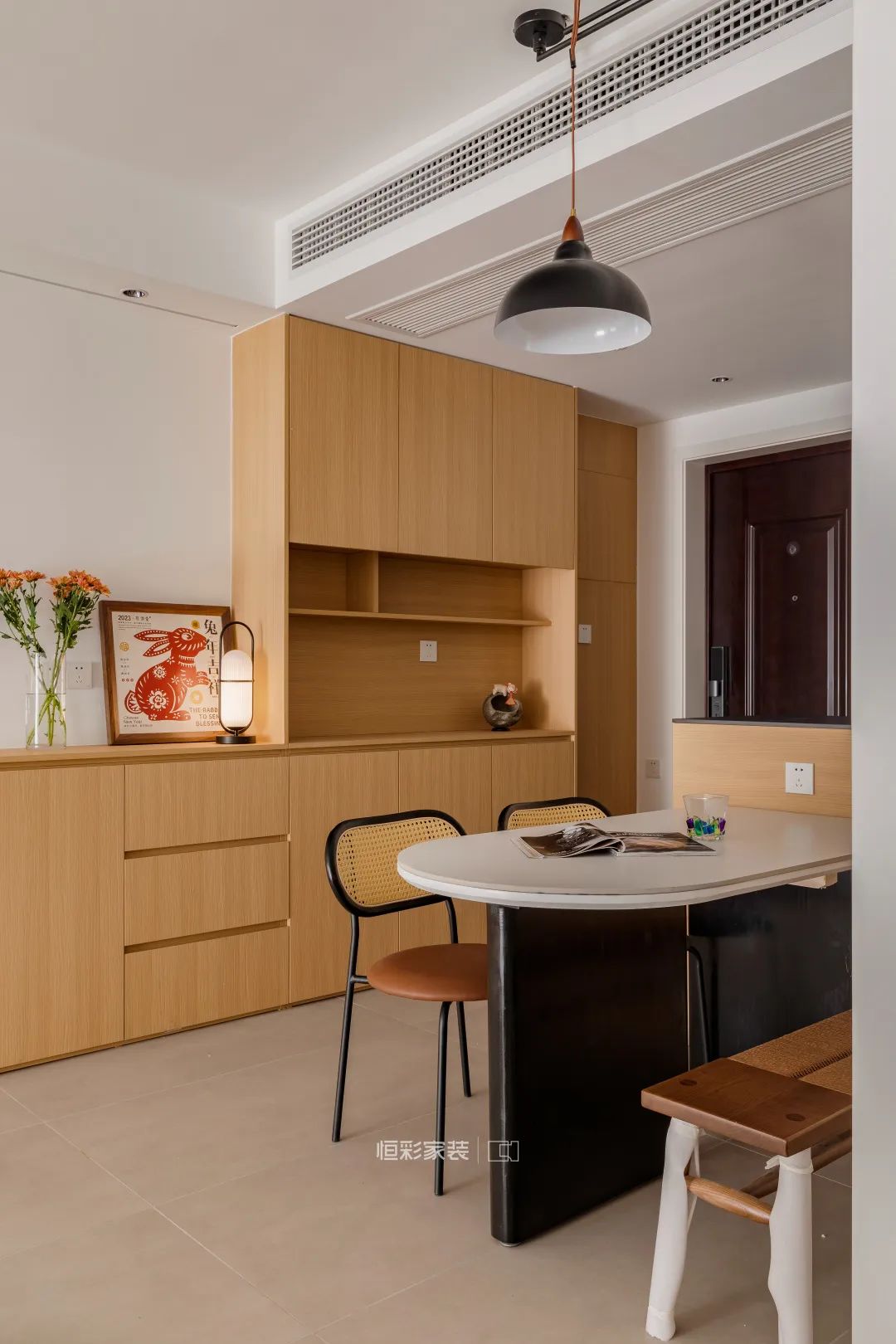 吧台柜用作收纳,内置插座,满足日常用餐小电器的使用,非常实用。餐边墙体往卫生间位置内推,嵌入餐边柜和冰箱,白色门规、木色柜体与整体家居风格相呼应,清新美观。