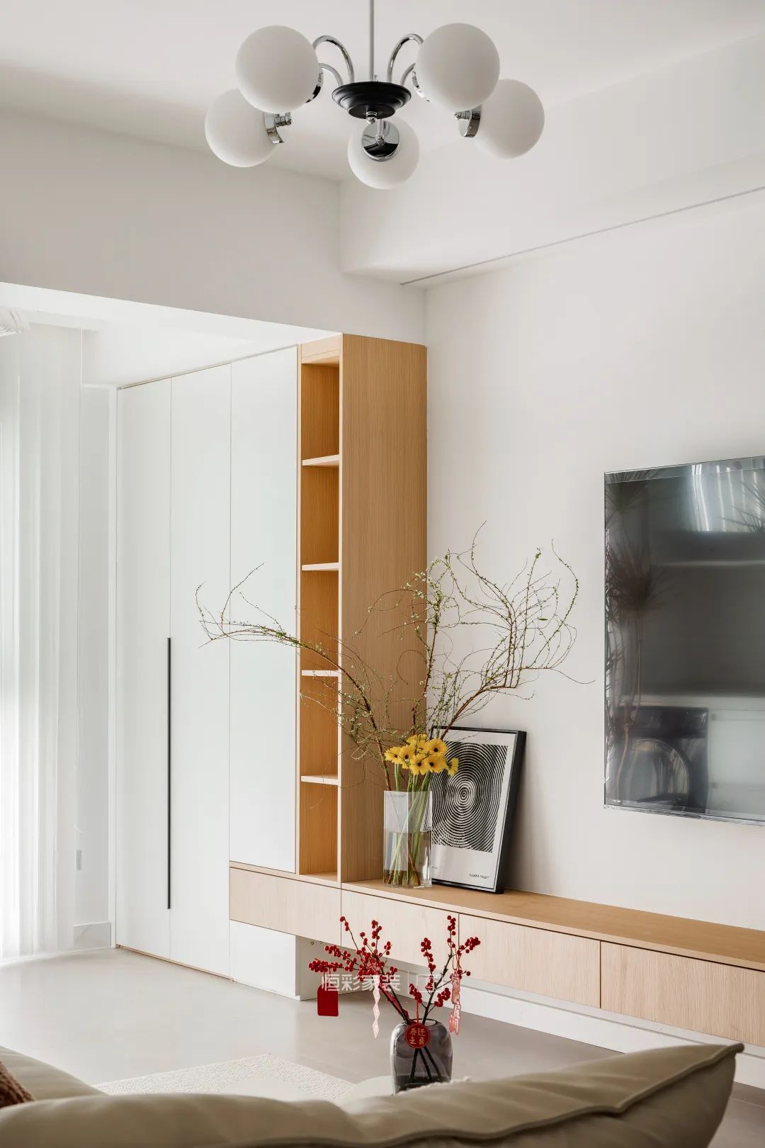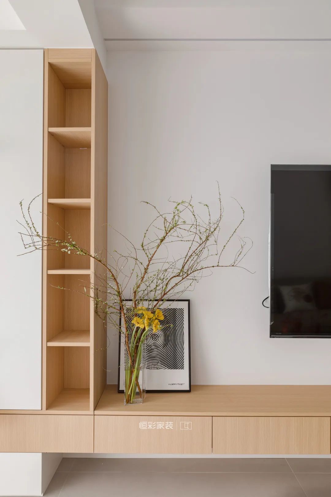 另一边靠墙做了一组开放式景观柜,用于收藏、置物,同时与阳台柜想衔接,木色柜体与白色阳台柜拼接,从硬装上增加了空间色彩和设计感。