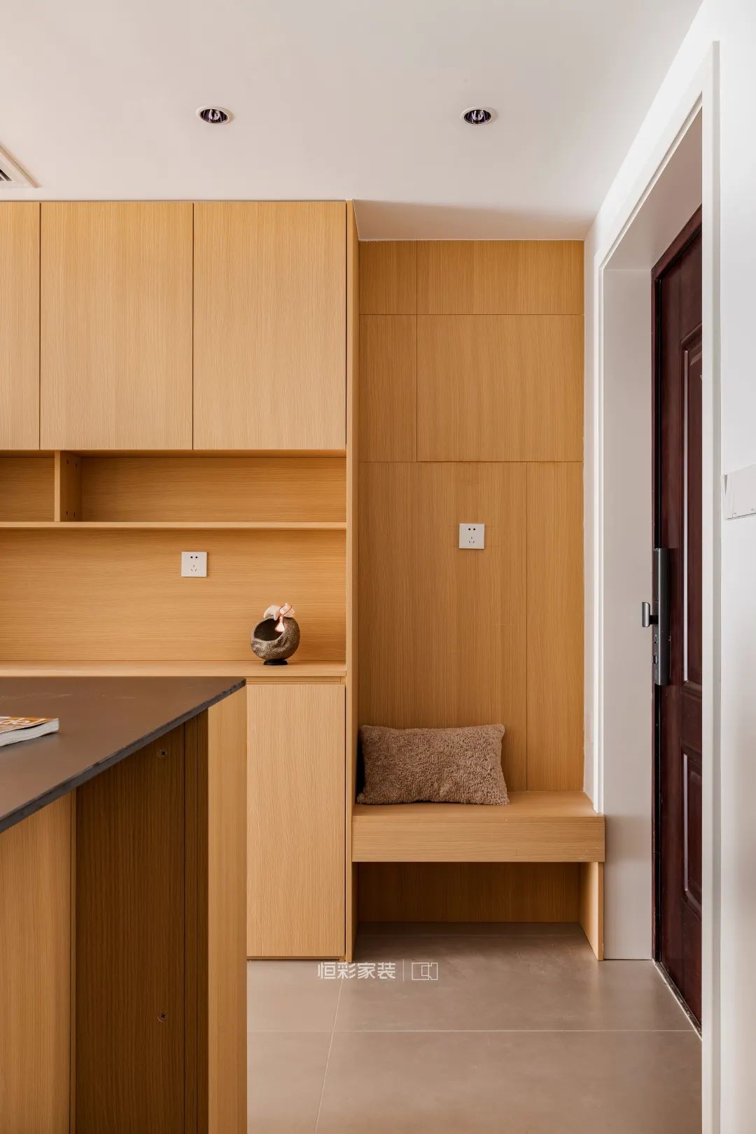 玄关利用墙面空间定制换鞋区和鞋柜,清一色的原木色简约耐看。