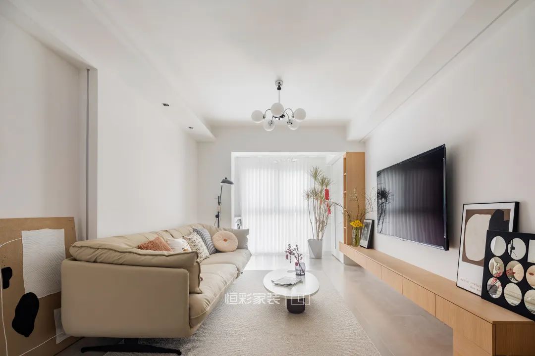 电视机背景选择简单的大白墙,利用原木色电视机柜装点空间的同时,增加储物空间。