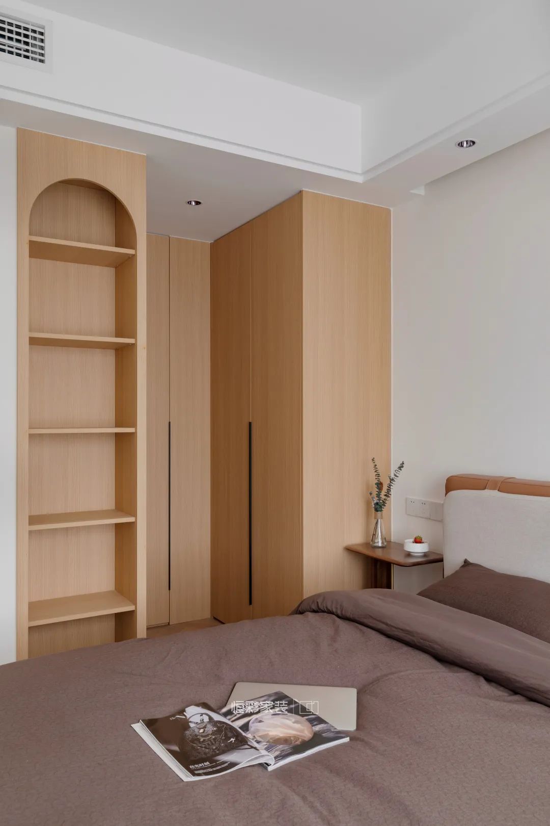 主卧的床边的转角空间充分利用,定制小型衣帽间,增加储物功能。房门边的墙体空间则用来定制收纳柜,拱门设计增加仪式感。