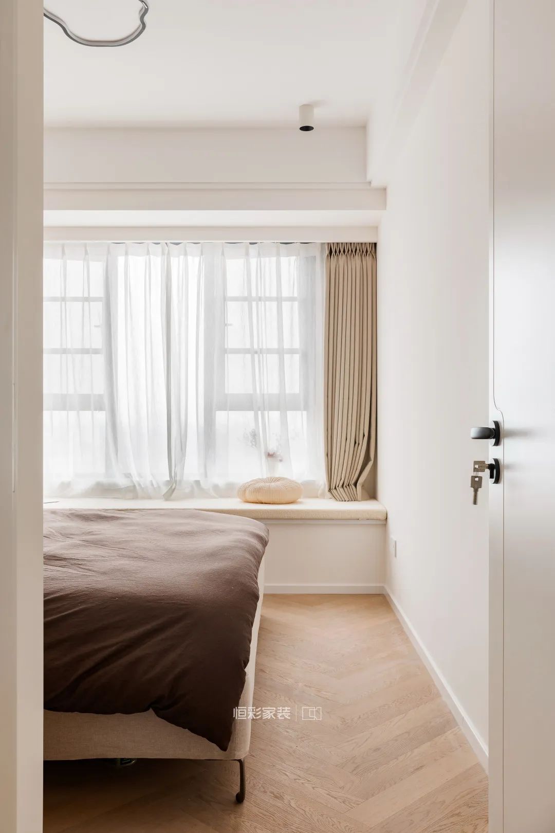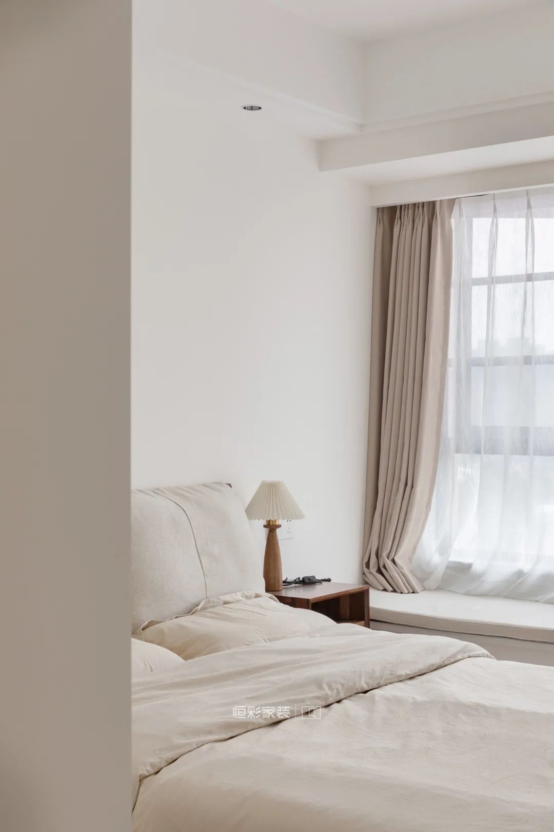 次卧空间选择奶白调色系,米白色的床品、窗帘搭配简约的硬装陈设,给人安静的思考空间。