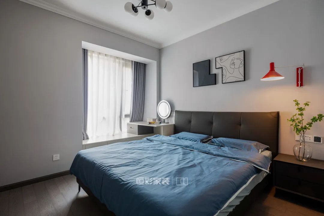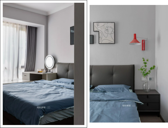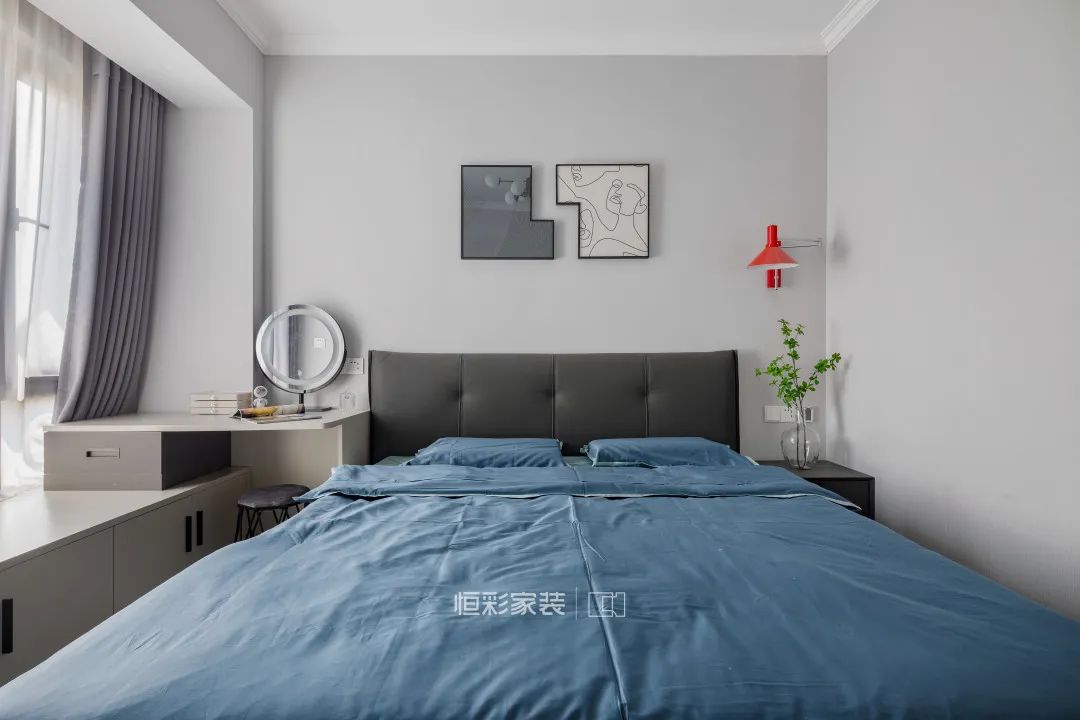 主卧空间选择大面积浅灰色墙纸装饰背景墙,吊顶收口在细节上更加完美。灰色家具搭配同色系撞色装饰画,整个空间简约清爽,雾蓝色床品搭配淡雅素净,一盏红色的壁灯悄然入画,作为整个空间的亮色处理。