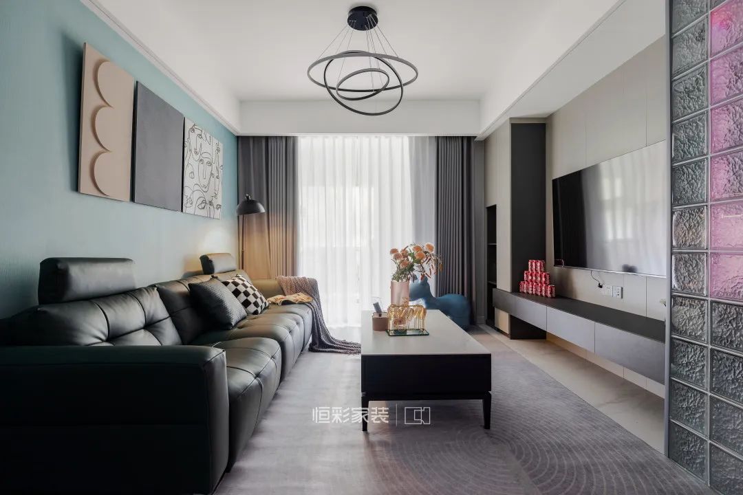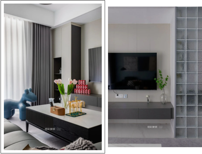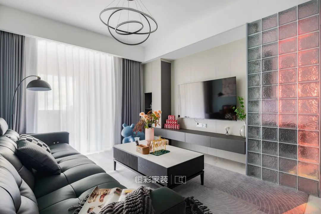 电视背景墙的延伸处作为卫生间干区,利用玻璃砖对干区进行隔断,半透光的材质不影响客厅整体空间的采光,也能减少硬隔断带来的空间封闭感。