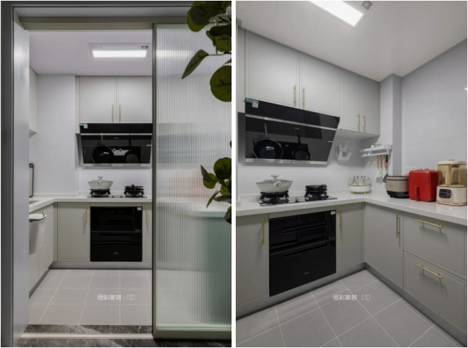 原先开放式厨房加上隔断墙,再利用长虹玻璃移门进行油烟阻隔,既不影响视觉采光,又能很好地解决油烟问题。厨房空间较小,白色墙砖和吊柜颜色,让空间看上去更加清爽通透,视觉上减少压抑感,小U型设计合理地规划厨房功能区块。