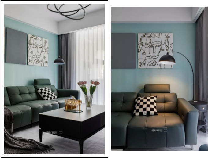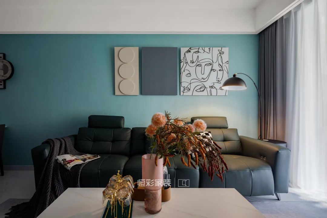 客厅选择蓝色乳胶漆作为主背景装饰色,大面积亮色提亮了空间色彩,在背景色的修饰下,选择饱和度较高的深色真皮沙发作为远近色调和视觉距离感。