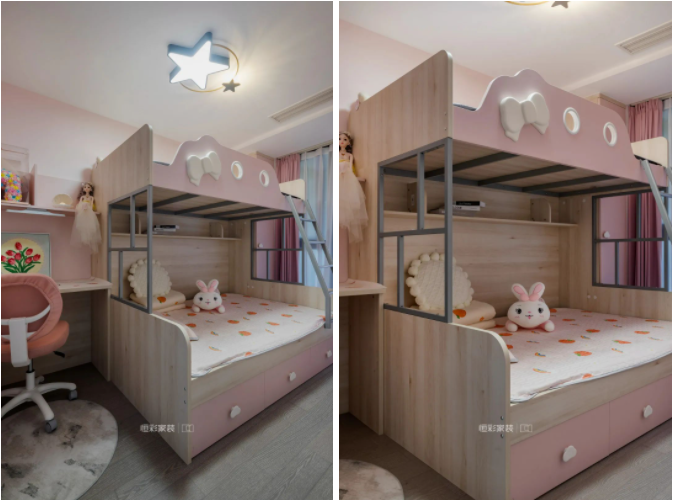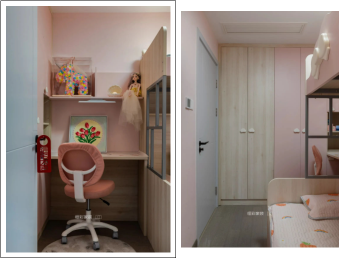 屋主两个女儿年龄相差不大,粉色双人上下床可以满足现阶段需求。旁边从主卧挪过来的空间用于定制衣柜和学习区,原木色和粉色两个衣柜撞色处理,让两位小朋友各自拥有独立的收纳空间。
