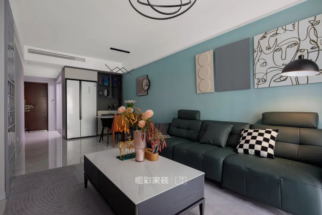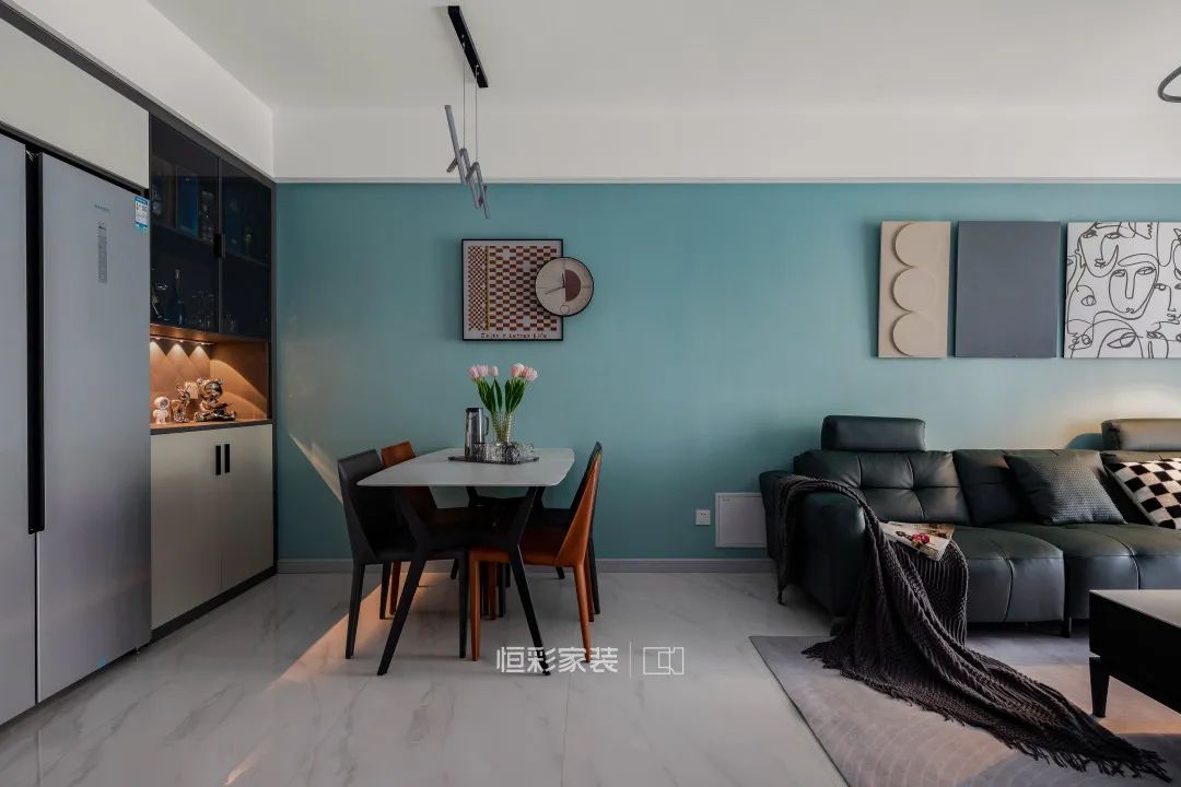 餐厅和客厅位于同一个区域内,蓝色背景墙的延伸放大了整个大空间的视觉感,完善了空间的整体设计感。