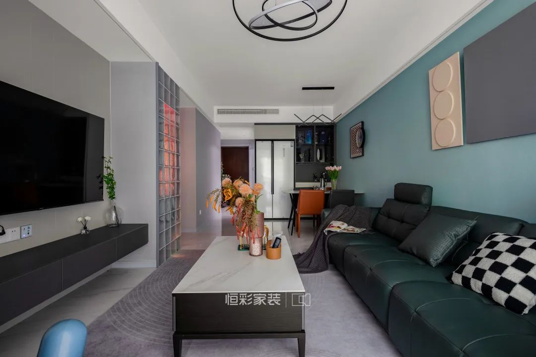 客厅拆除了原始户型中与主卧之间的隔断墙,通过定制主卧衣柜打造隔断墙,背靠衣柜作为电视机背景装饰,留出电视空间,定制收纳柜搭配悬浮电视机柜设计,黑白配色增加视觉冲击感。墙面重色彩的运用,顶部做了简化处理不压层高,下挂式局部吊顶增加了空间层次感,从而实现空间的简单清爽。
