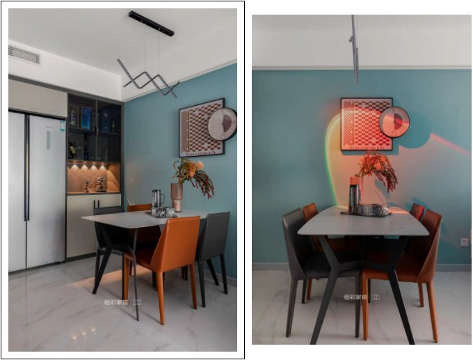 餐桌椅搭配装饰画的定位,决定了整个餐厅的空间位置,背靠厨房隔断墙体空间定制餐边收纳柜和冰箱柜,用作餐边收纳和冰箱摆放。简约的几何吊灯为整个空间提供主照明光源,网红日落灯灯为整个空间增加氛围感。