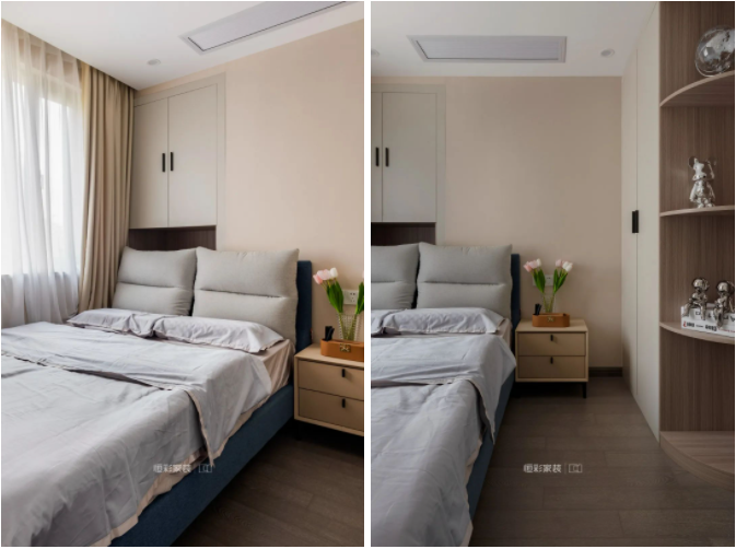 次卧作为备用房间,给父母留着偶尔过来小住。淡裸色背景墙装饰素雅温馨,床头凸出空间定制收纳柜用作床头收纳。考虑到父母居住,衣柜设计做了户型边角处理,增加了安全性。