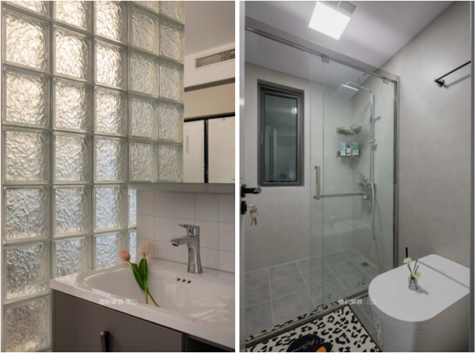 原始户型中卫生间较小,无法做干湿分离处理。将卧室和客厅空间进行合理规划,得到了一个一分为二干湿区分离的卫生间。干区用玻璃砖进行隔断,不阻碍公共区域的采光,湿区则有了更大的发挥空间,长方形淋浴房使用起来体验感更佳。