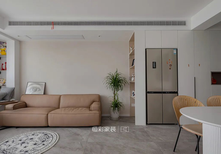 玄关柜延申至客厅,嵌入冰箱,解放厨房空间,冰箱侧边空间也不浪费,开放式收纳格是家庭相册和小摆件的好去处。