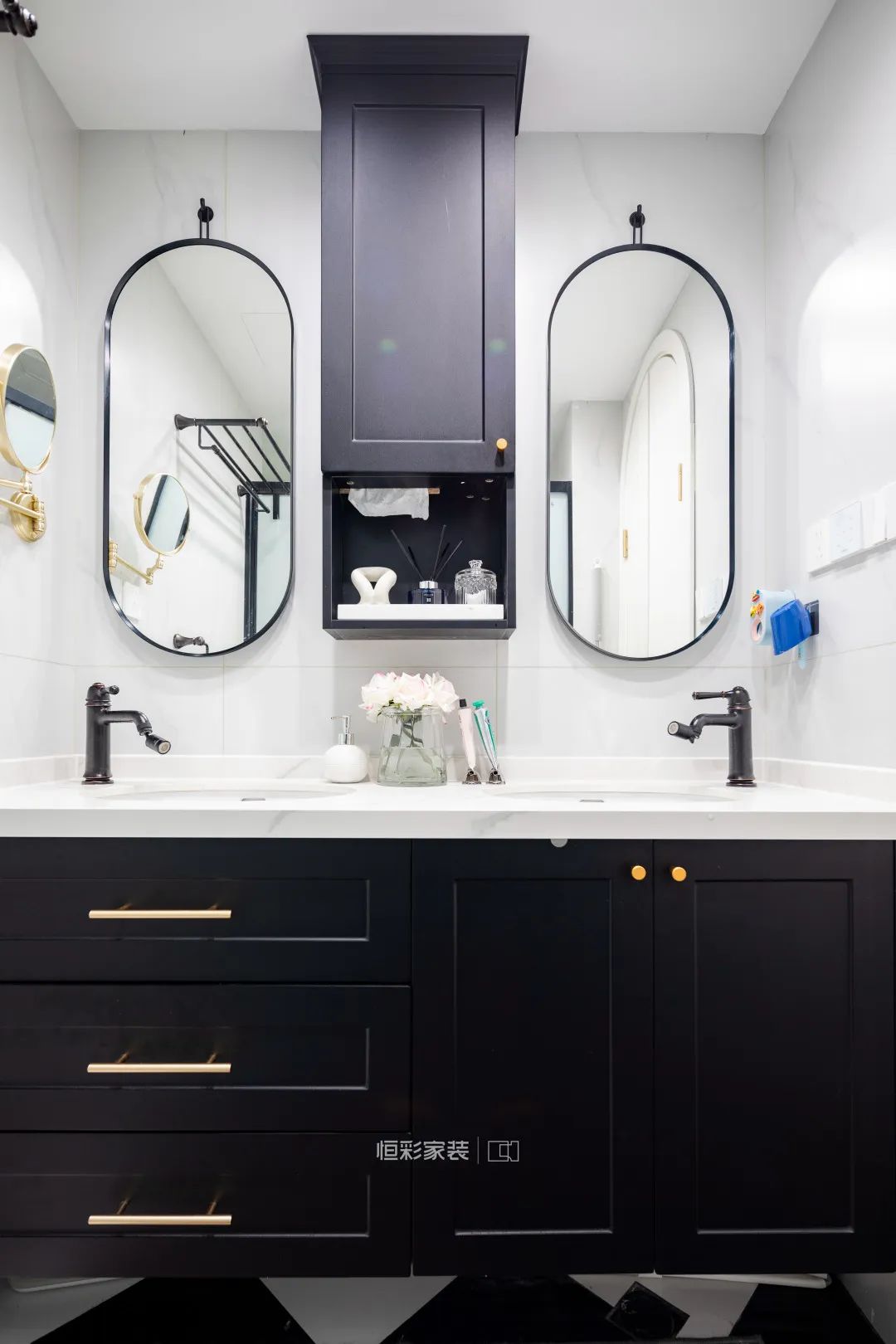 黑色浴室柜呼应客餐厅柜体,窄边的椭圆镜简约美观,双台盆对称设计实用又有爱,独卫的小户型家庭都可以参考哦。
