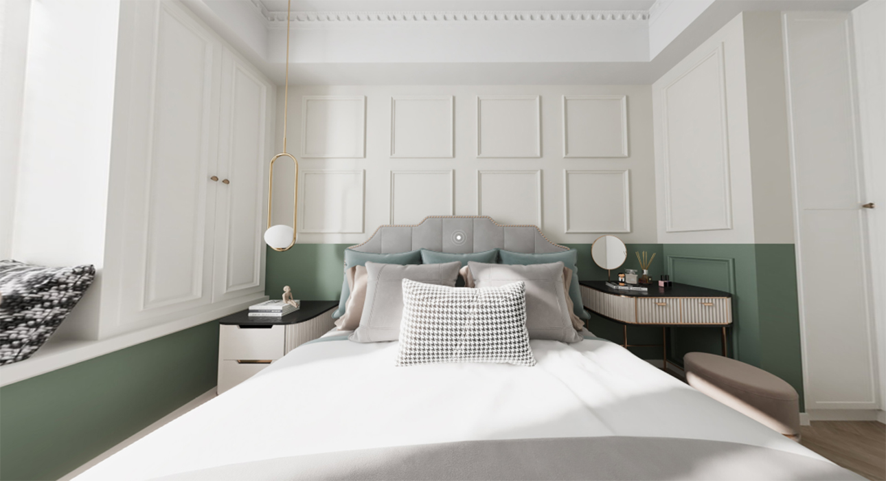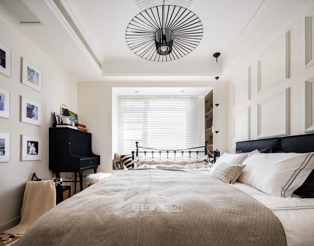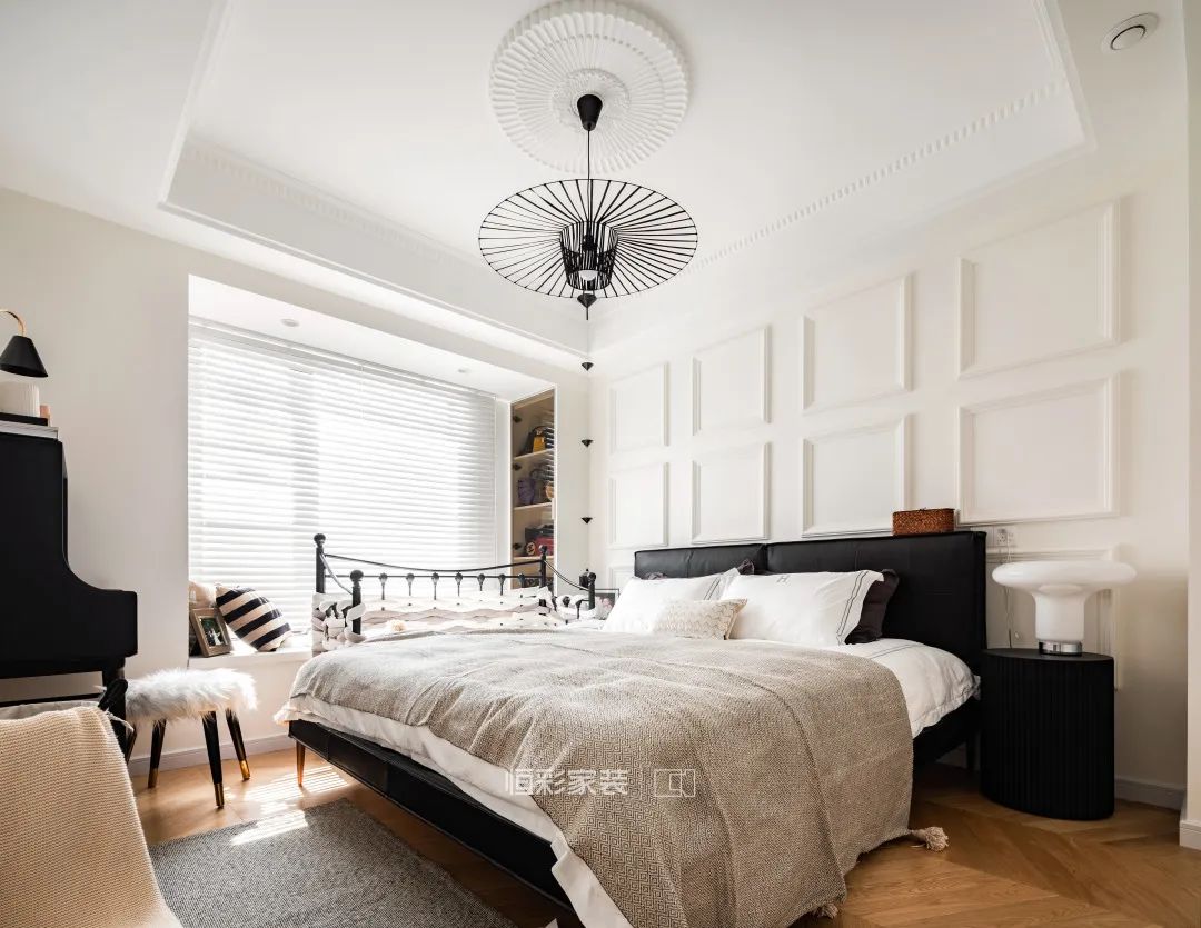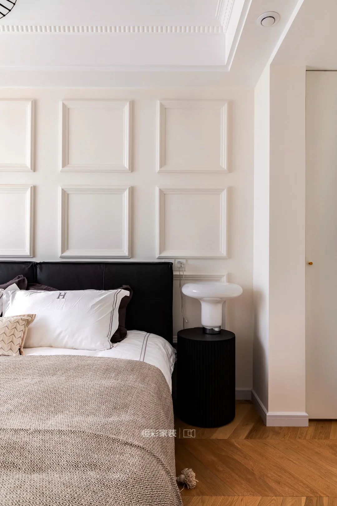 背景墙做组合框石膏线,浅浅的奶白调高贵典雅,床尾对称布置相框,多幅影集横向展开,是屋主亲手挂制,也成为卧室里很有意义的点缀。