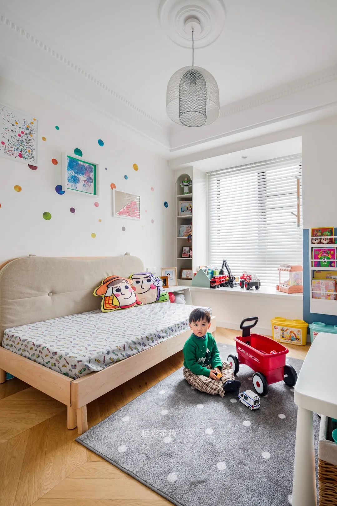墙面铺满了孩子自己的涂鸦,在星星点点的彩色背景下童趣无限。为孩子保留足够的空间,木地板上铺上地毯各种大型玩具也毫无压力。