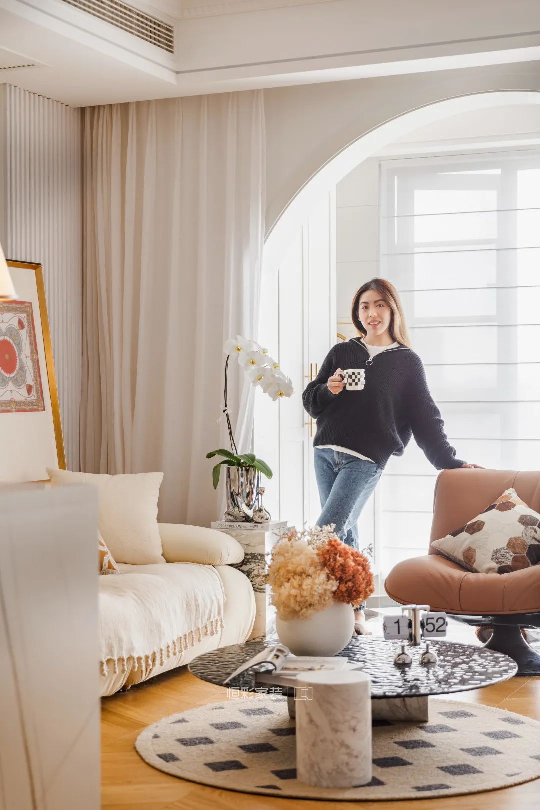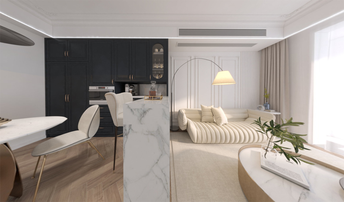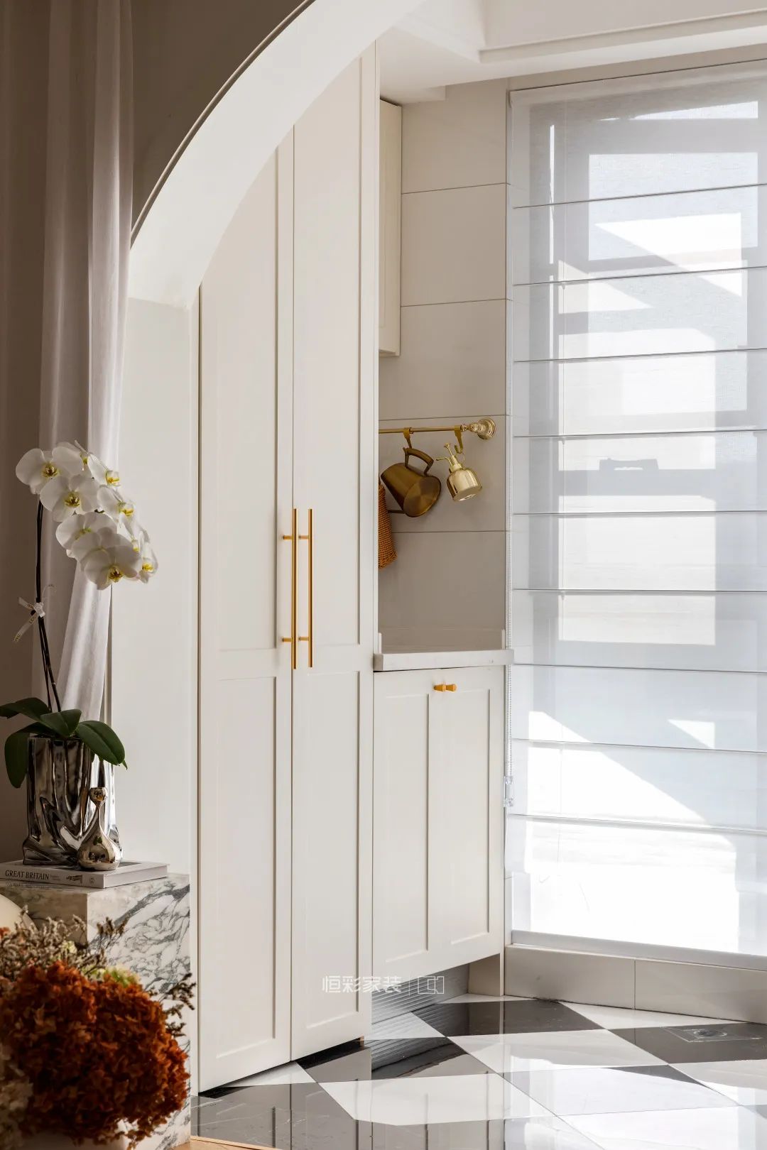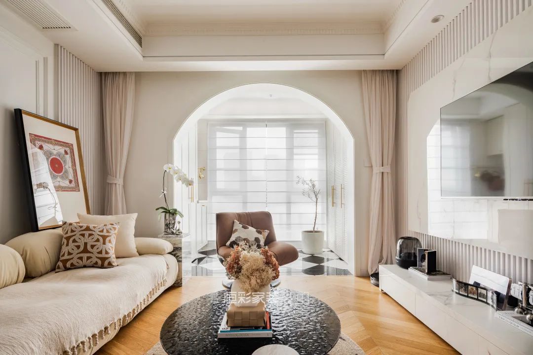 法式复古风格通常是具有雕刻和曲线的,以典雅和精致为主。吧台将原本一体化开放式的客餐厅隔开,从餐厅望向客厅,拱形门洞拿捏法式精髓,精致而充满仪式感。