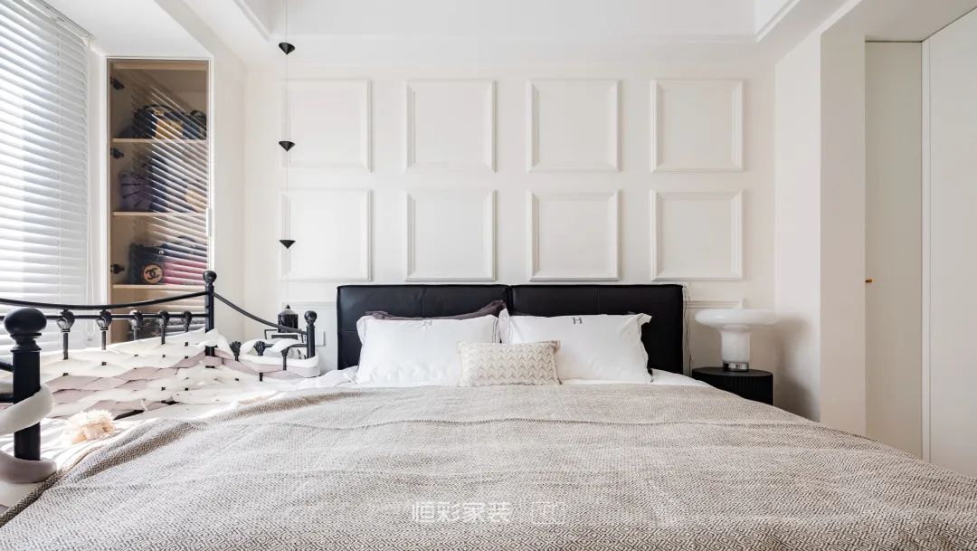 主卧风格的打造也花了很多心思,整体延续了公区的色系搭配法则,大面积奶油白让整个空间看起来复古又慵懒。