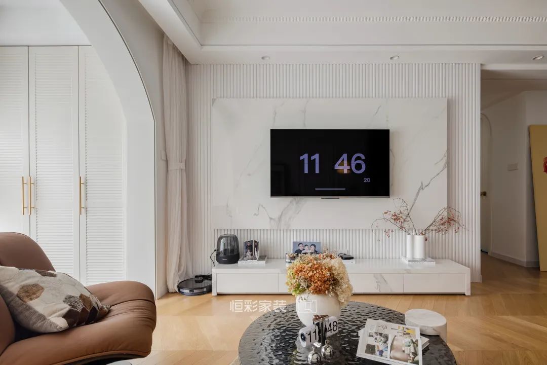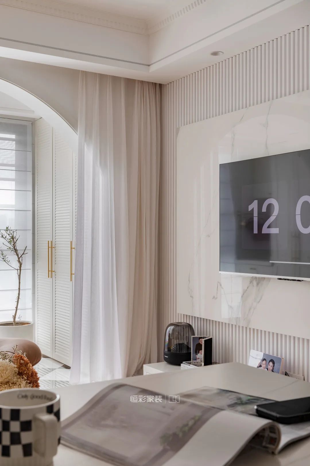 电视背景墙相对偏现代感,白色木格栅做底,大理石为电视背景,质感高洁雅致。整体也不乏统一感和协调感