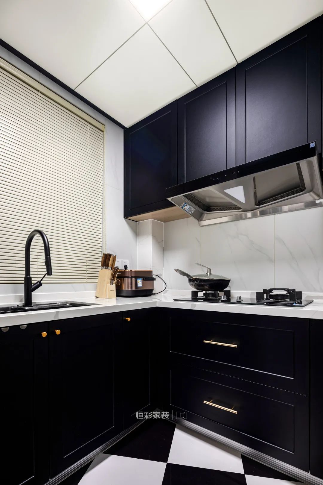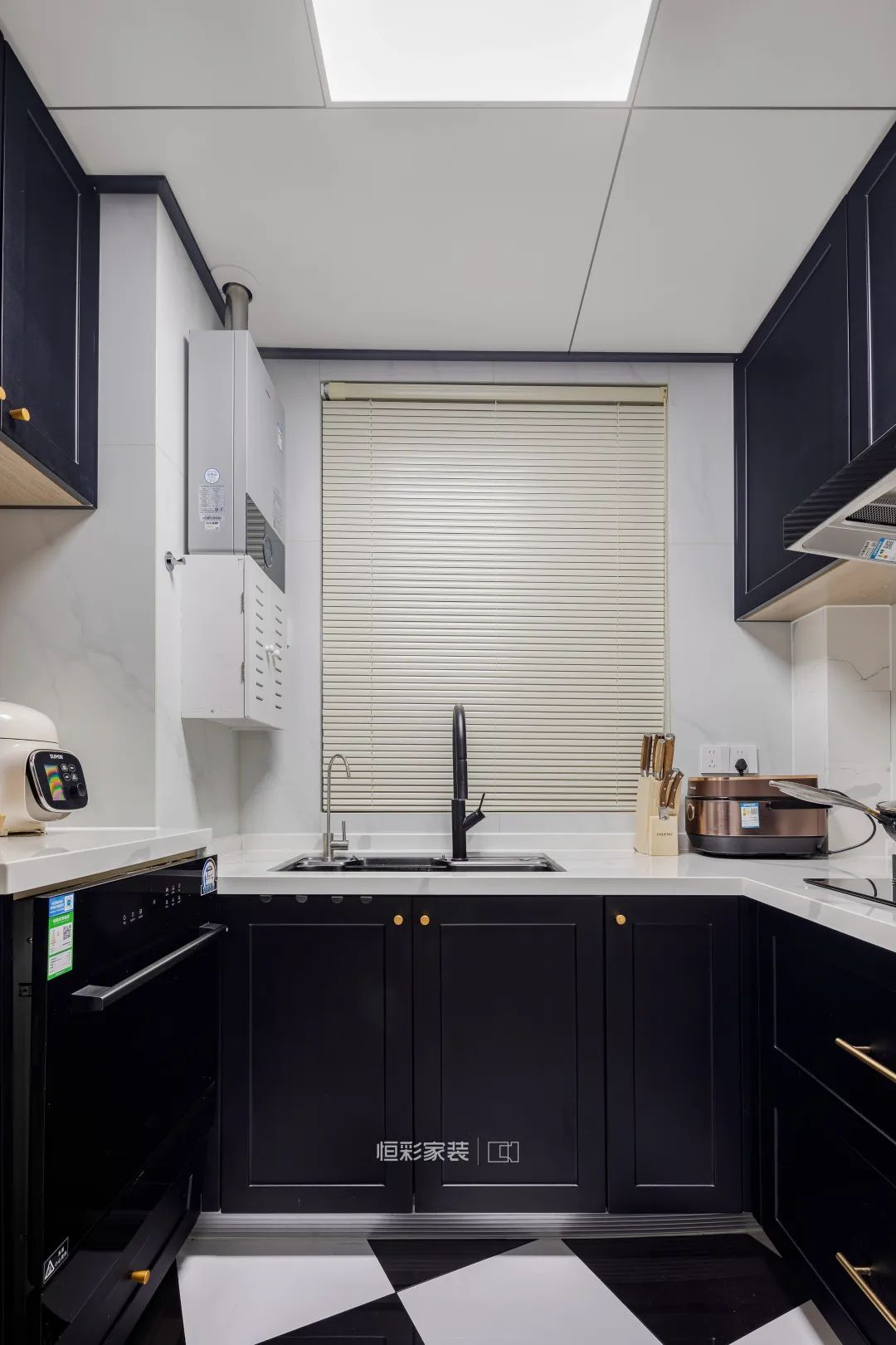橱柜与客餐厅柜体一样的黑色,黑金配色复古典雅,实用性来说也很耐脏,地面铺设与阳台一样的几何拼接小砖,提升时尚感。