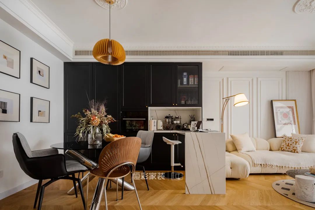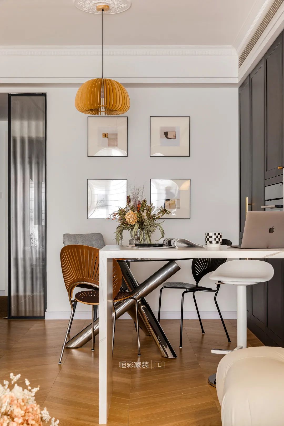客餐厅中间采用吧台做衔接,增加互动性,同时也兼顾到女主人的居家办公需求,悬空吧台发挥实用性也不影响不同功能分区之间的空间连接。