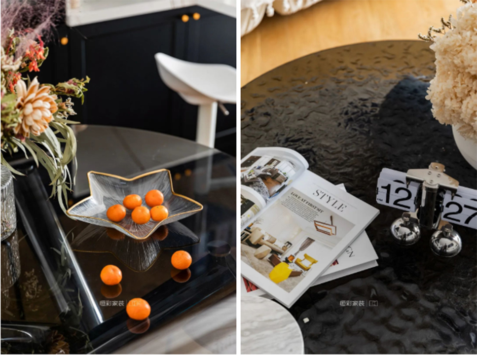 家居风格的打造离不开小件家具,大理石的水波纹茶几设计感满满,在阳光映射下为客厅增加波光粼粼的梦幻美感。