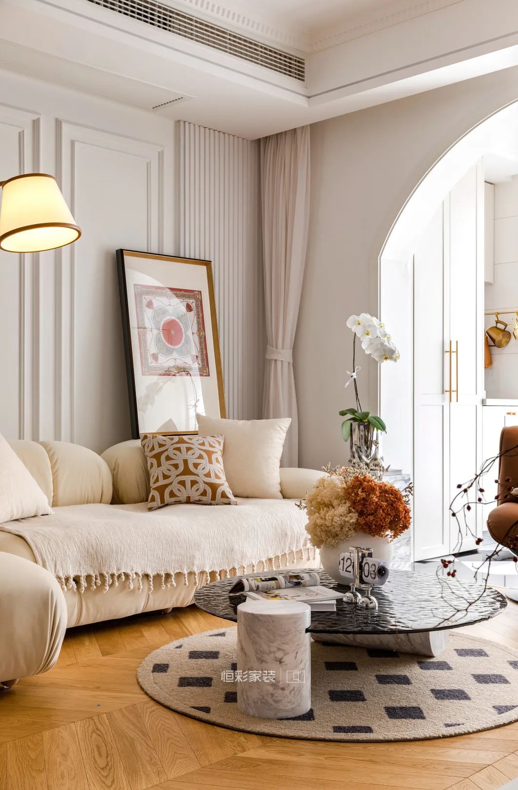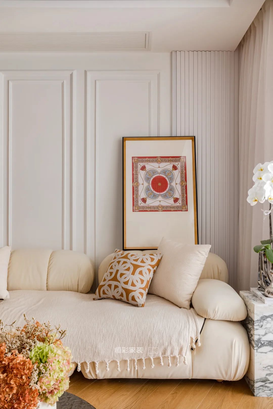复古装饰画与石膏线结合,装点空间的优雅韵味,在客厅发呆都有电影走进现实的感觉,自己像女主一样被美好的事物围绕。