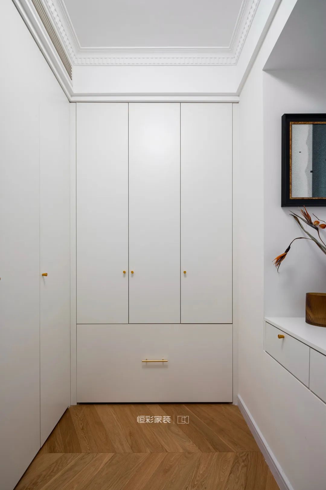 北次卧目前主要作为衣帽间使用,考虑到老人偶尔来住,设计了暗藏折叠床随时使用。