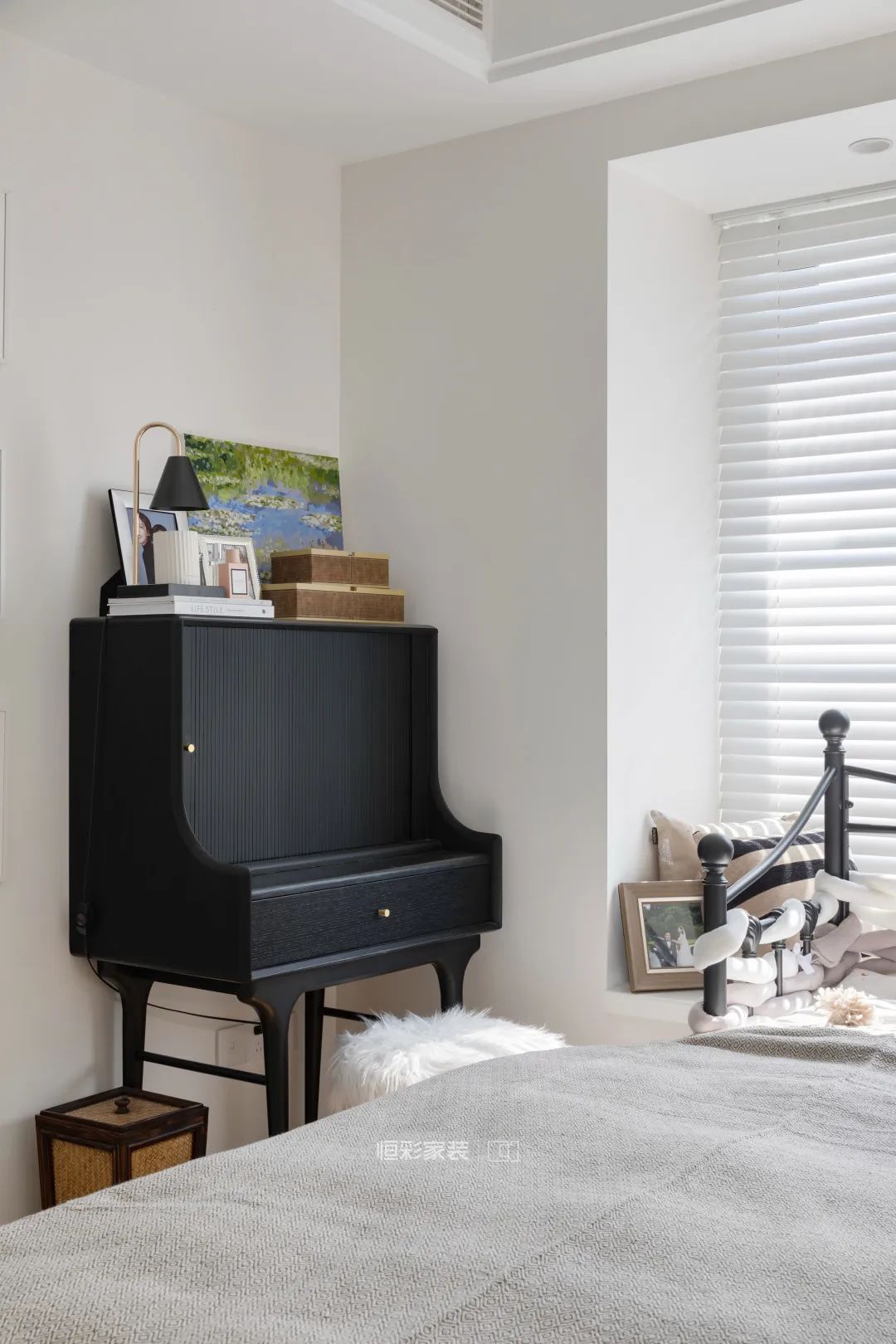 主卧床同样选择黑色,让整个空间沉静下来,儿童床与主床做平,摆放一侧,与孩子保持互动亲密感,同时不影响休息。飘窗一侧定制收纳柜,透明玻璃柜门防尘,颜值出圈,作为屋主的包包展示区。
