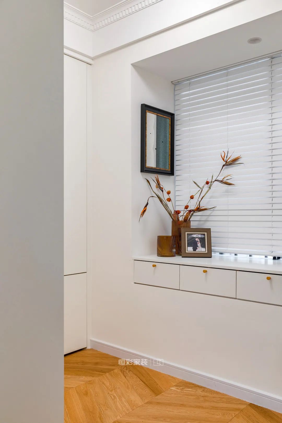 通铺的人字拼地板带来温馨踏实的居住体验,墙面以奶白为主色调,赋予空间满屋浪漫情怀。