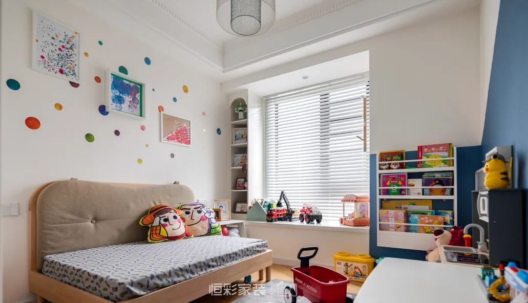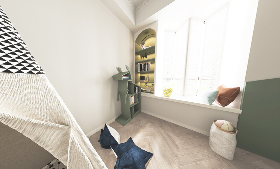 次卧收纳空间有限,靠窗设计壁龛作为展示区,成品收纳架挂墙收纳读物。沙发床和学习桌边角都做了圆角处理,消除尖锐和生硬,同时也更安全。
