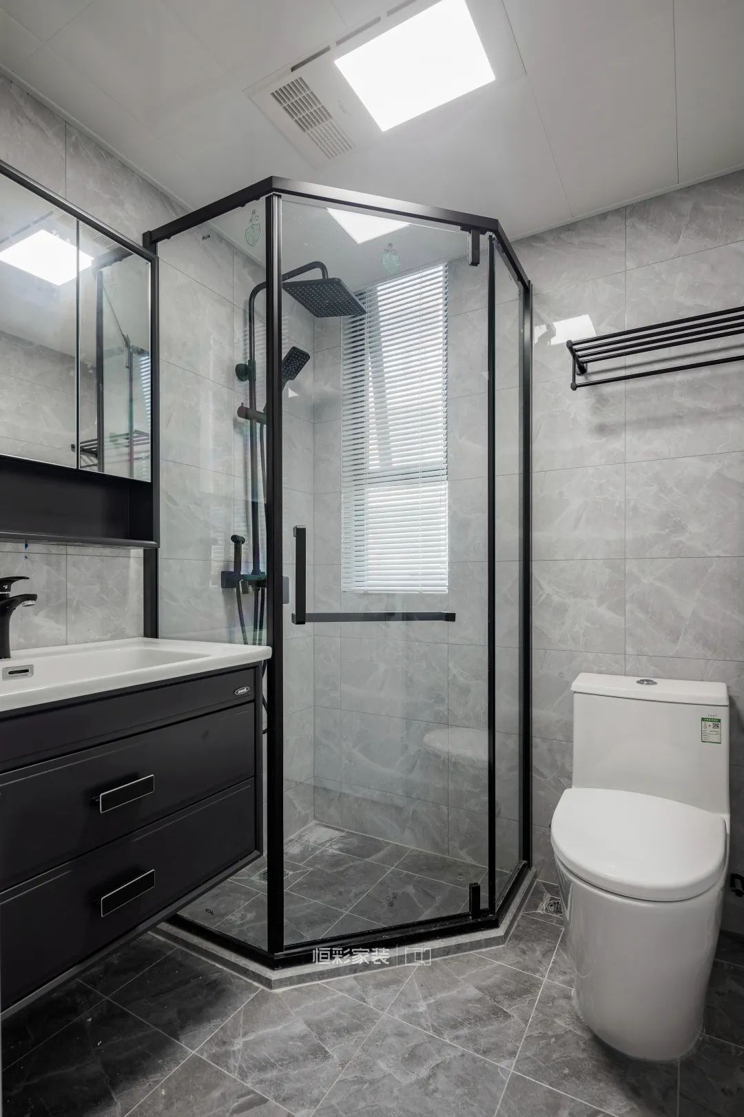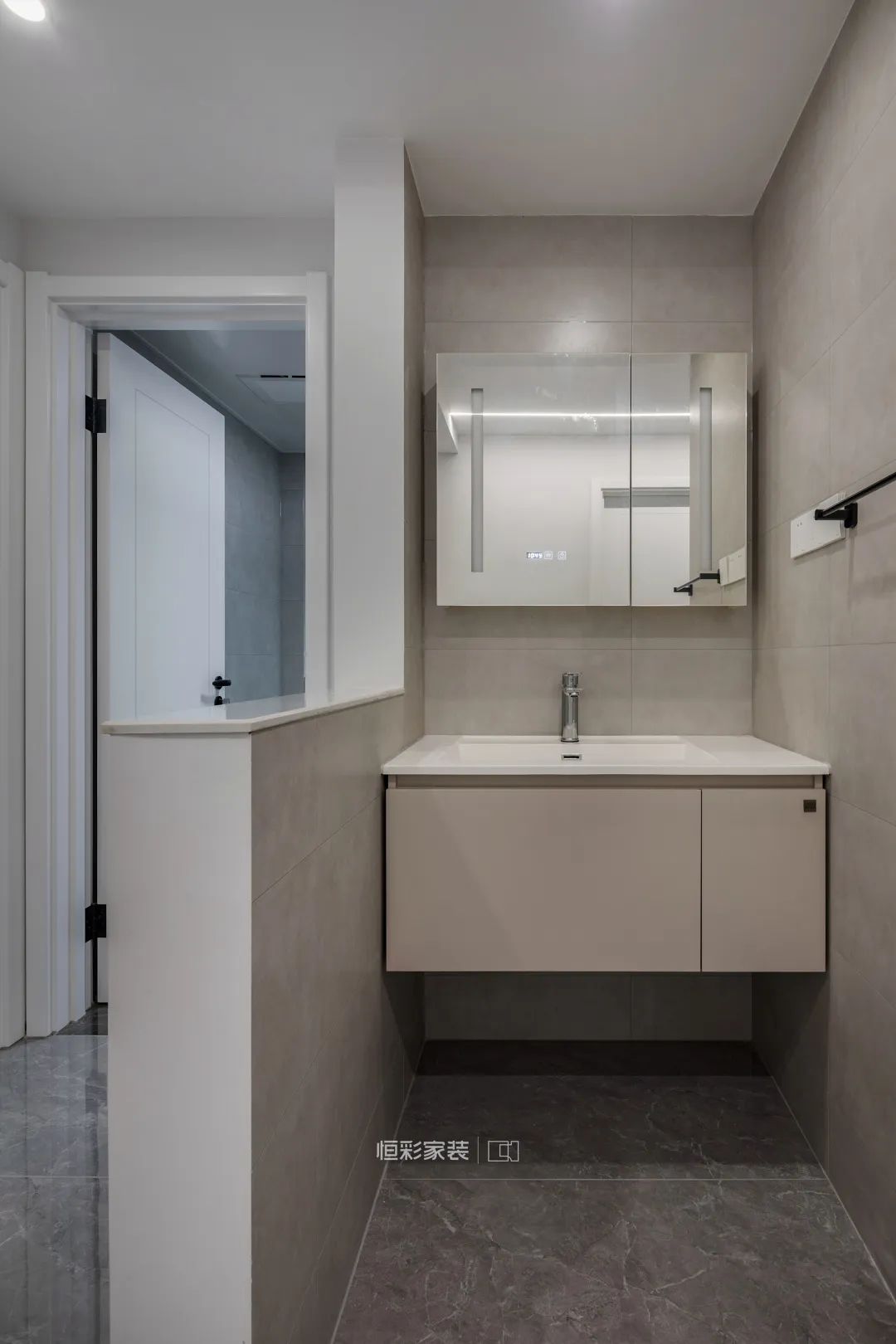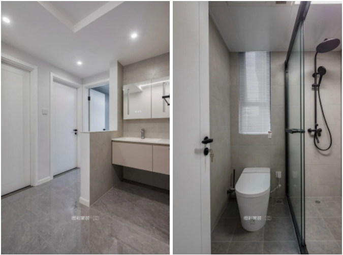 二楼一家三口共用卫生间,做干湿分离处理。干区隔断做半墙设计改善卫生间采光。