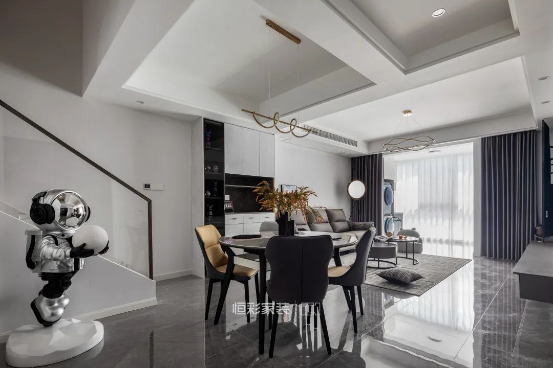餐厅保持原有格局不变,利用梁体结构打造回形吊顶,靠墙定制整面餐边收纳柜+观赏柜。
