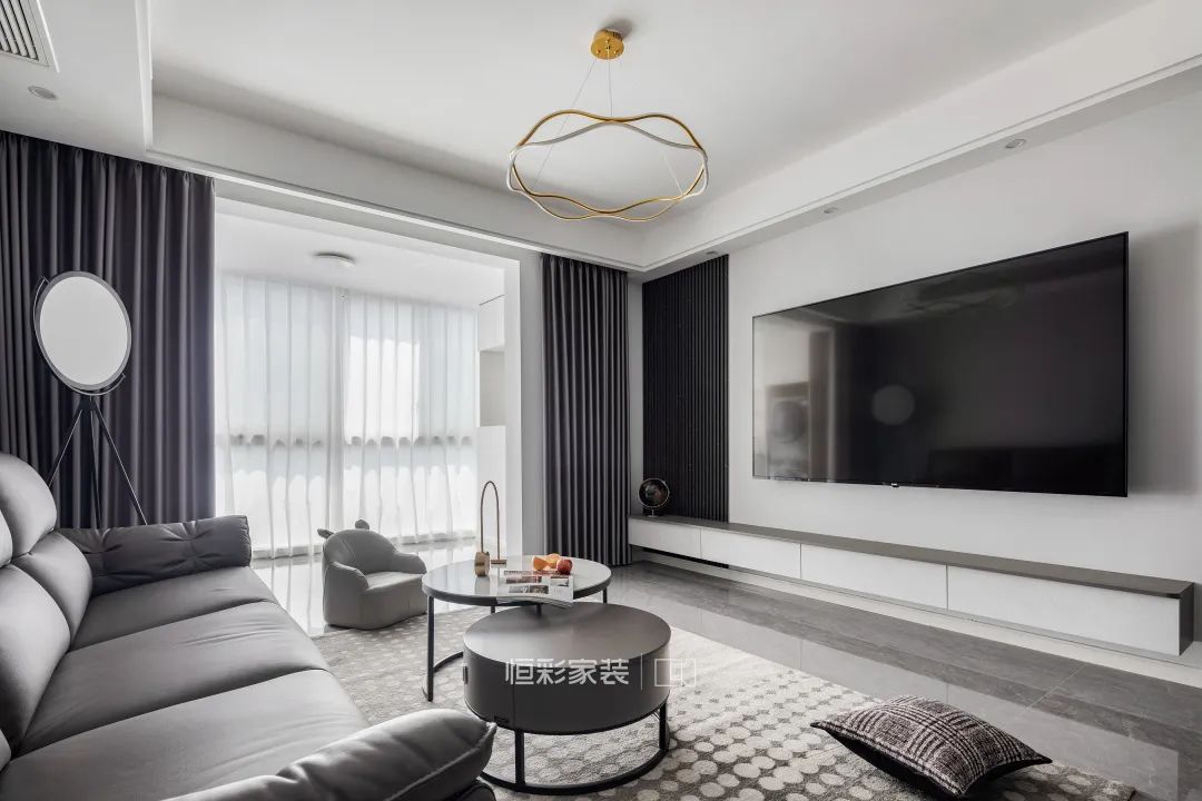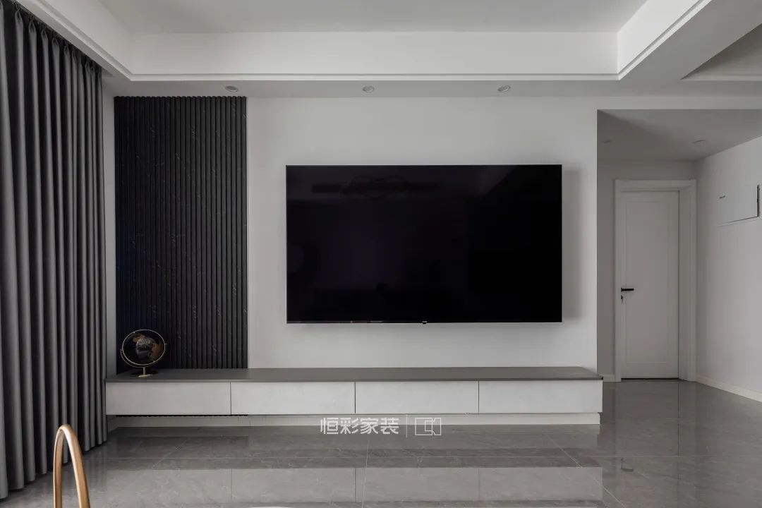 悬浮电视柜设计,消除卫生死角,视觉上更轻盈,消除深色带来的沉闷感。