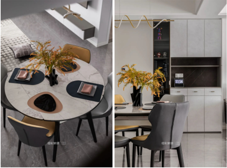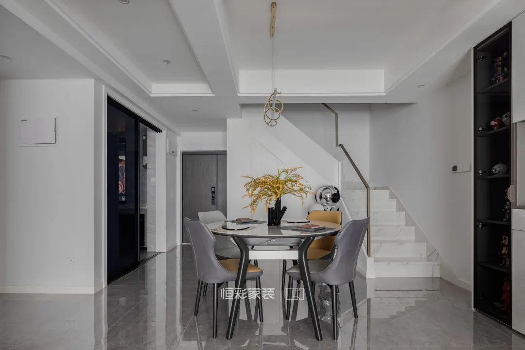 轻奢风的餐厅吊灯,搭配大理石餐桌超有氛围感。白色大理石纹餐桌小有轻奢味道,圆形餐桌聚合人气,一家人围坐在餐桌旁感受家的温暖。同时也中和了吊顶带来的棱角感。