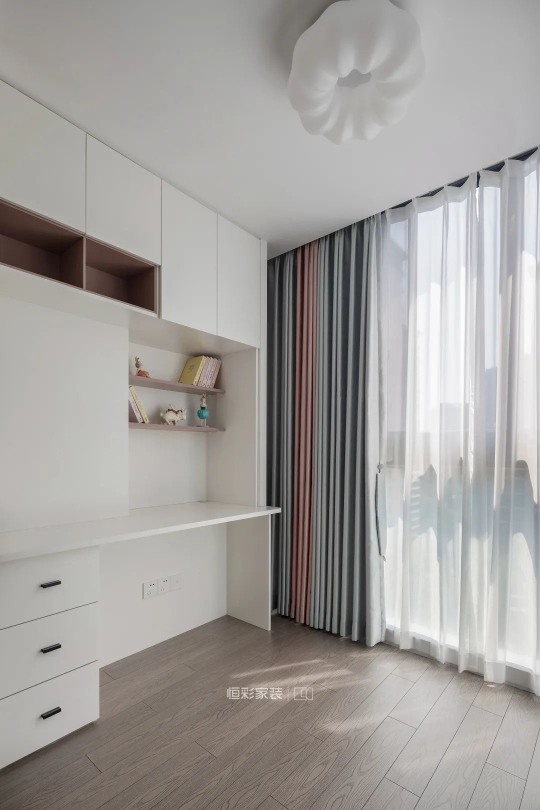 儿童房选择非常浅的咖色作为背景色。进门靠墙空间定制整面衣柜,增加衣物收纳空间。